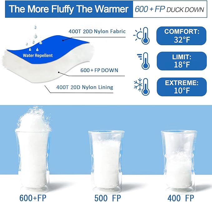 - Keep Warm: Backpacking sleeping bag Filled with 2.2lbs 600 FP premium duck down, comfort temperature 18°F-32°F, limit 10°F. Double zipper design prevents cold air, added chest insulation for better warmth