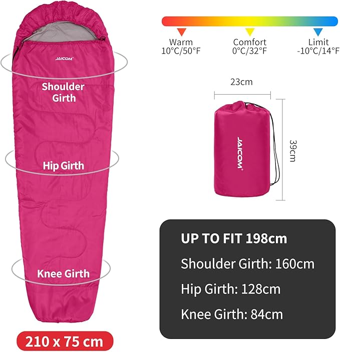 - COMPACT AND LIGHTWEIGHT PACKING - The JAICOM Mummy Sleeping Bag is different from traditional winter sleeping bags, it is not bulky and heavy, the included bag measures: 15.4x9.1in,can be compressed and will save about 35% of space and weighs 3.53lbs, so it can be easily carried on trips. This sleeping bag provides plenty of internal space for people from 6'1''-6'6'', so toddlers, youths can also use it