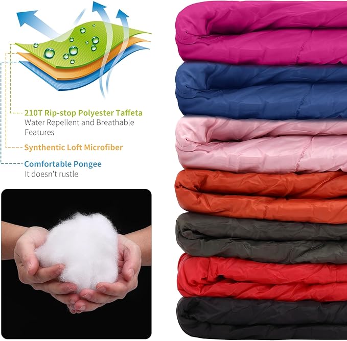 - GIVE YOU A COMFORTABLE SLEEP - Unlike cheap sleeping bags on the market, this 0 degree sleeping bag is lined with high quality pongee, which is not only warm and cozy, but also won't stick to your body, so you can turn over freely and won't make a “rustling” sound. The outer shell is made of 210T polyester fiber, which is abrasion-resistant and breathable, ensuring that you sleep without sweating and providing you with a comfortable sleeping environment