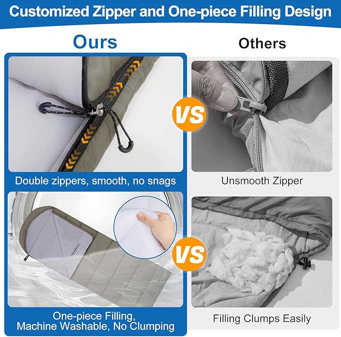 - Hand-out Design Sleeping Bag: Our adult sleeping bags feature a unique hand-out design, allowing you to move your arms freely without removing the bag, equipped with a windproof flap to keep out the wind, keeping you warm and comfortable
