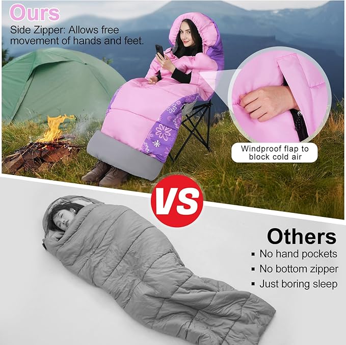 - Hand-out Design Sleeping Bag: Our adult sleeping bags feature a unique hand-out design, allowing you to move your arms freely without removing the bag, equipped with a windproof flap to keep out the wind, keeping you warm and comfortable
