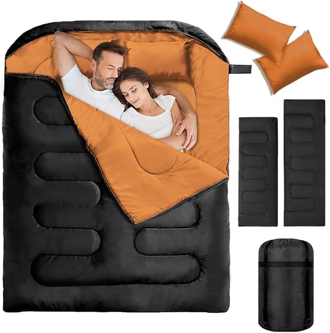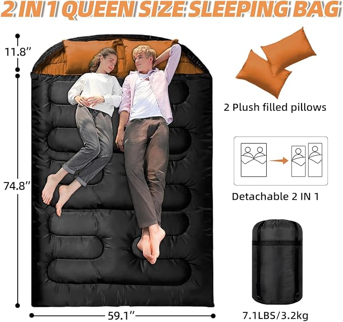 Double Sleeping Bags for Adults, 2 Person Camping Sleeping Bag for Cold Weather & Warm, Queen Size Sleeping Bag with 2 Pillow, Sleep Bag for Camping, Hiking, Backpacking
