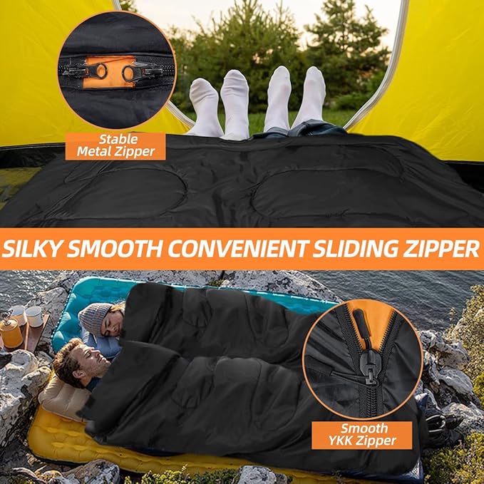 - [DURABLE AND SMOOTH ZIPPER]: This double sleeping bag is equiped with durable and smooth YKK zippers, with a reliable design and smooth operation. Using a wrap around zipper, the sleeping bag can be divided into two separate sleeping bags or two large blankets, the bottom zipper allows for foot ventilation and provides a comfortable sleeping bag environment