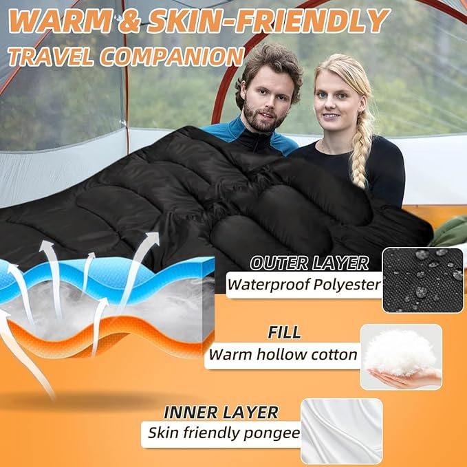 - [SUPERIOR MATERIAL FOR DURABILITY]: The outer layer of the double sleeping bags for adults is made of 210T polyester, and the inner layer is made of 190T Polyester pongee. The outer layer is made of 210T polyester, with higher density, thicker and more durable fabric, and better waterproof performance. It is more suitable for high-intensity, long-term outdoor activities