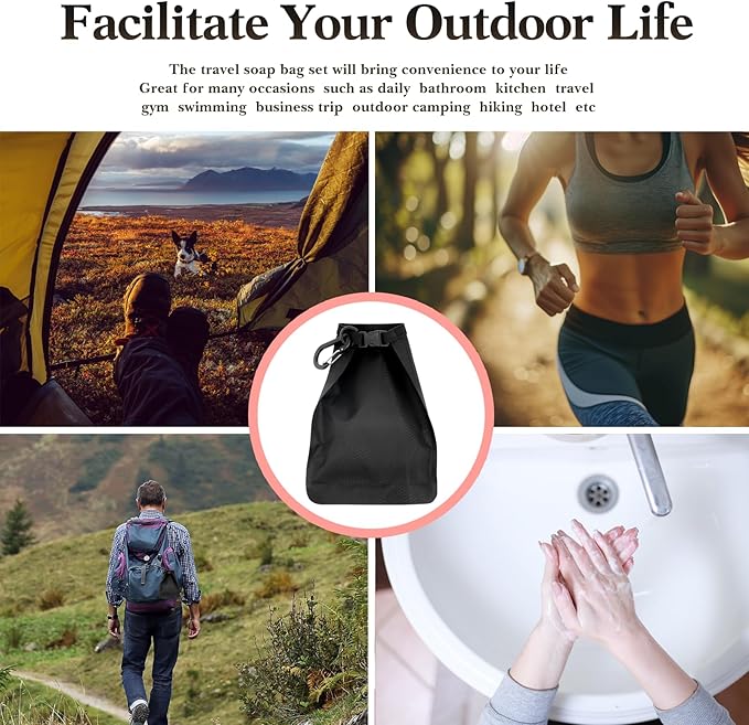 - Quick-Dry Mesh & Carabiner Hook for Easy Access : The breathable mesh soap saver pouch allows soap to dry quickly, eliminating mushiness. The built-in carabiner lets you hang this bar soap travel container on backpacks, showers, or tents for instant access anywhere.
