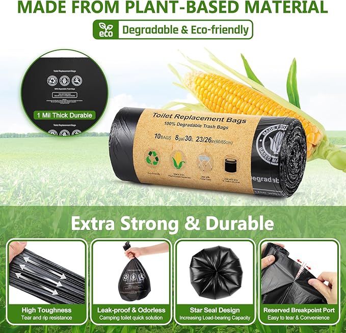 - 【Easy To Use & No Mess】BLIKA portable toilet kit is perfect to be accompanied with 8-gallon toilet replacement bags and eco absorbent gel. After using, rinse the seat with wipe paper as needed to keep clean. Camping toilet bag is made of plant starches and contain NO polyethylene. The portable toilet absorbent gel can quickly turns waste liquid into a solid gel that won't leak or splash out and gives off a light lemon scent.