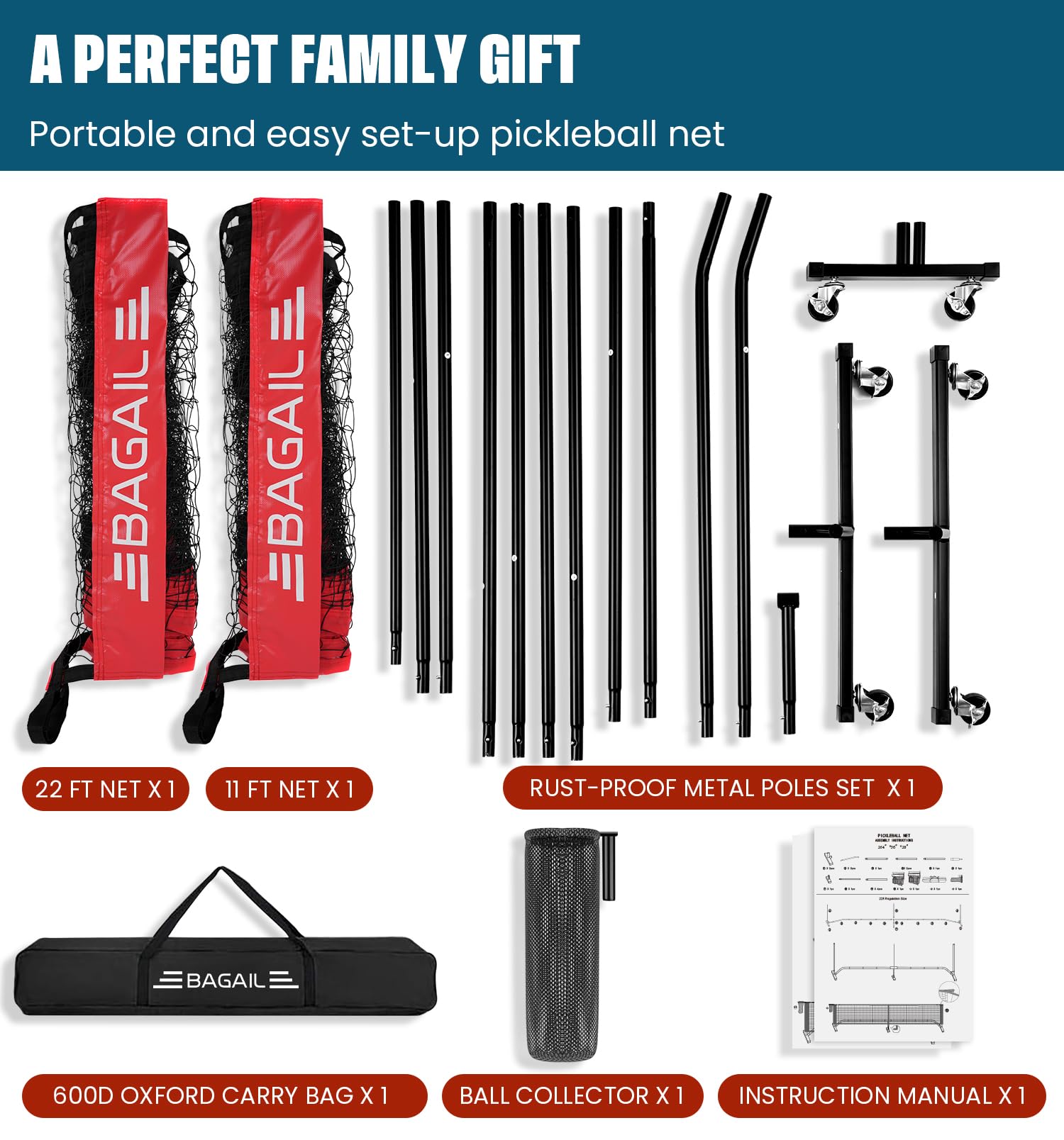 - 22FT or 11 FT Pickleball Net - BAGAIL's latest portable pickleball net features two nets - a full-size (36 'H x 22'W) USAPA regulation net and an 11'W half court practice net. Quickly assemble the frame system into 22FT or 11FT depending on your needs, and play with family or friends anywhere - in your driveway or on the indoor court. Suitable for players of all ages and skill levels. Whether practicing solo sessions or hosting social games, this 2-in-1 pickle ball net has you covered.