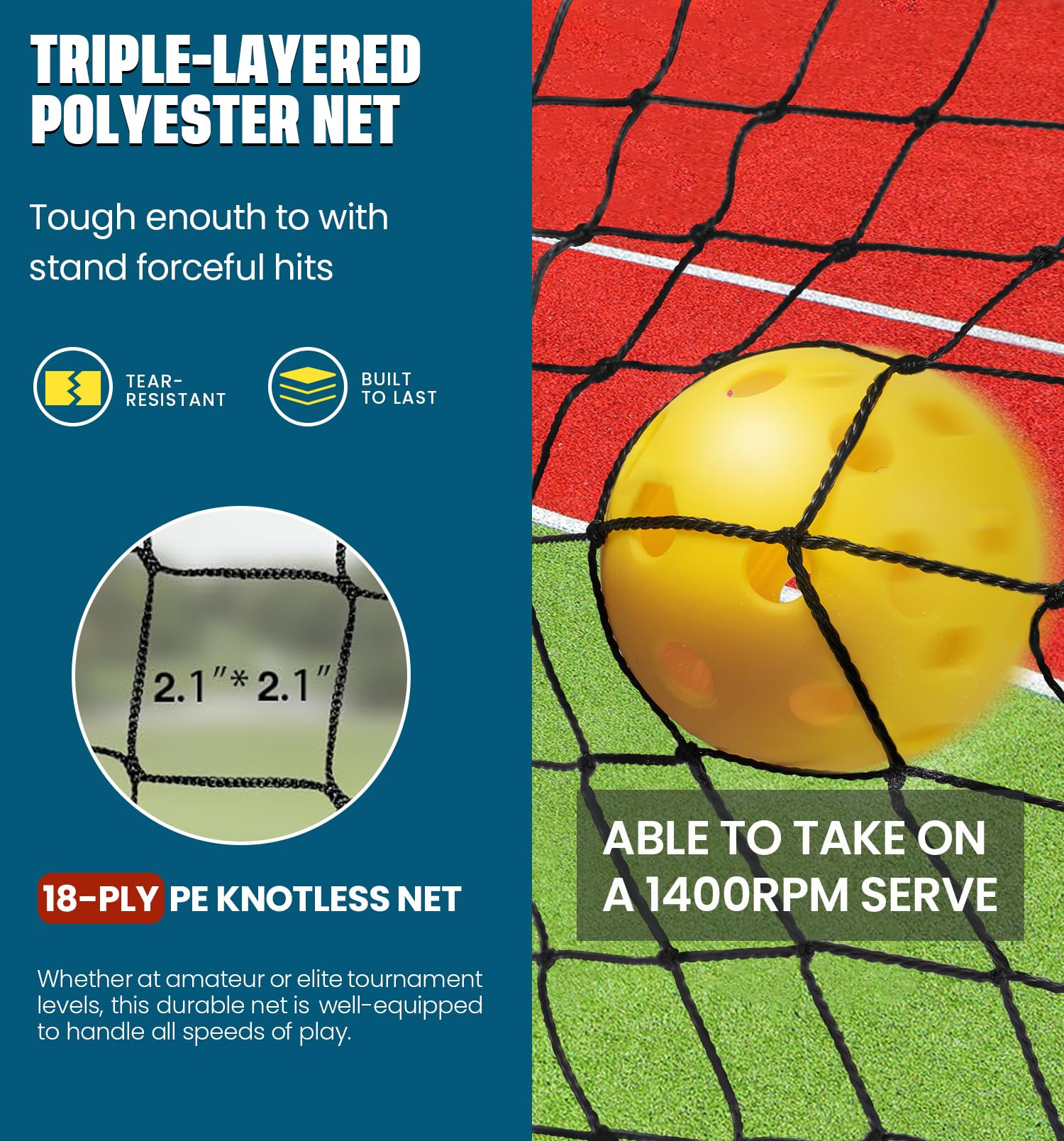 - Sturdy & Reliable - Our pickle ball net for driveway features reinforced 8-ply PE net, which is tear-resistant and more durable to withstand intense and forceful hits. Its powder-coated rust-proof 0.8 mm thick metal poles provides a solid foundation for playtime and is suitable for all weather and long-term outdoor use. Adjustable tension straps design on both sides of the net, along with the steel pole in the center, prevents the net from sagging during use and maintains the desired height.