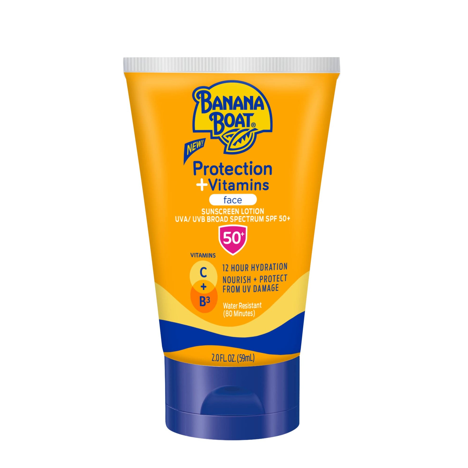 Banana Boat Protection + Vitamins Face Sunscreen Lotion SPF 50 | Travel Size Sunscreen for Face, Moisturizing with Vitamin C & Vitamin B3 Niacinamide, SPF 50 Sunblock Lotion, Fragrance Free, 2oz