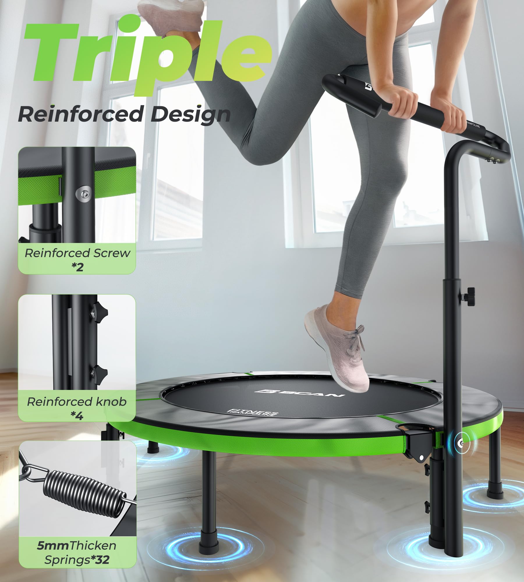 - Ultra-Stable System: Equipped with 2024 upgraded triple reinforced stability system and heavy-duty construction, Our mini trampoline let you say goodbye to the troubles of tipping over and wobbly handle