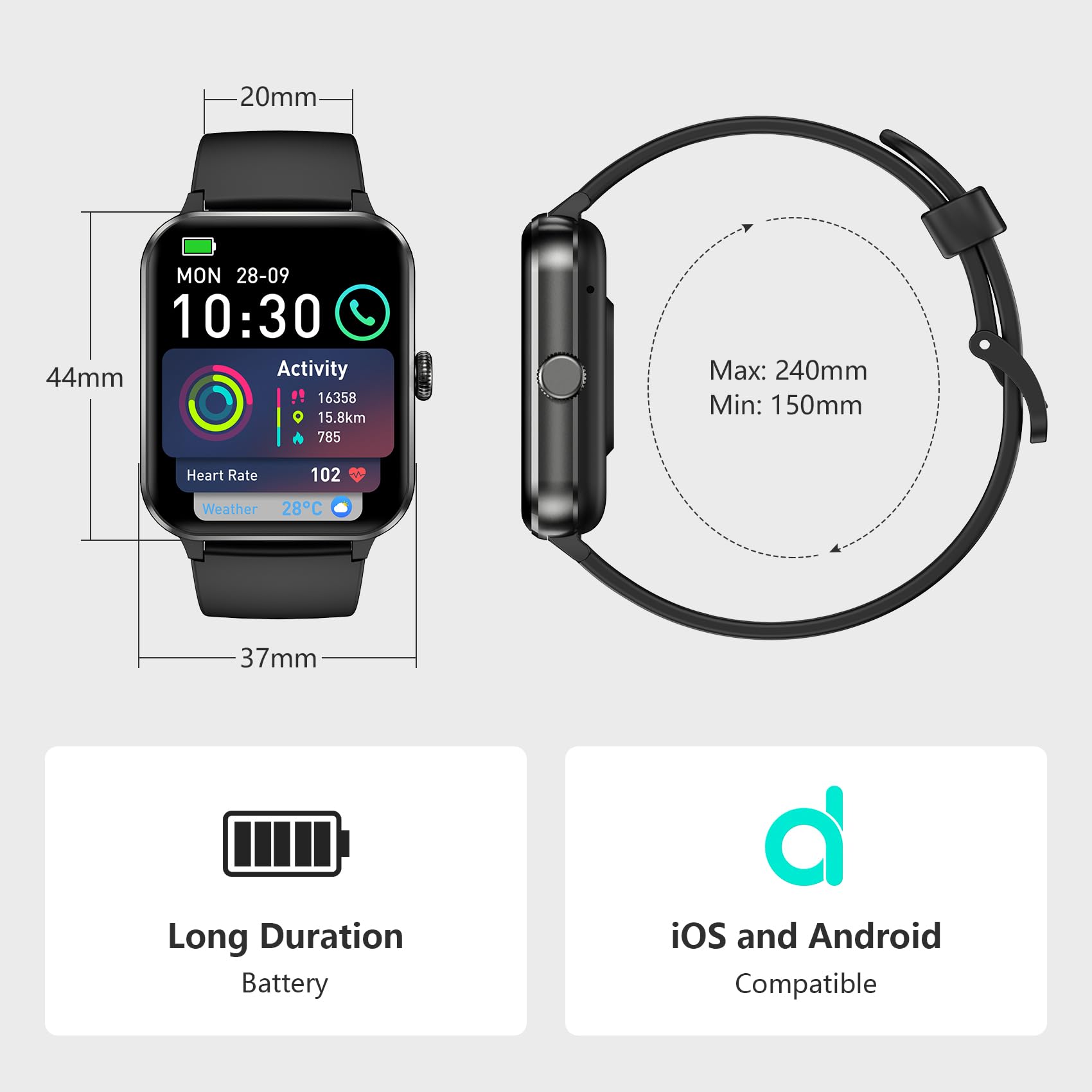 - đăMore Smart ToolsăApart from the features mentioned above, this smartwatch also offers other useful daily functions such as smart notifications, music control, camera control, casual games, weather forecast, sedentary reminders, alarm clock, stopwatch, timer, etc. Compatible with most Android 6.0 and iOS 9.0 or above smartphones, it comes with a built-in large capacity battery of 350mAh, which ensures up to 7 days of use and approximately 30 days of standby with just 2 hours of charging.