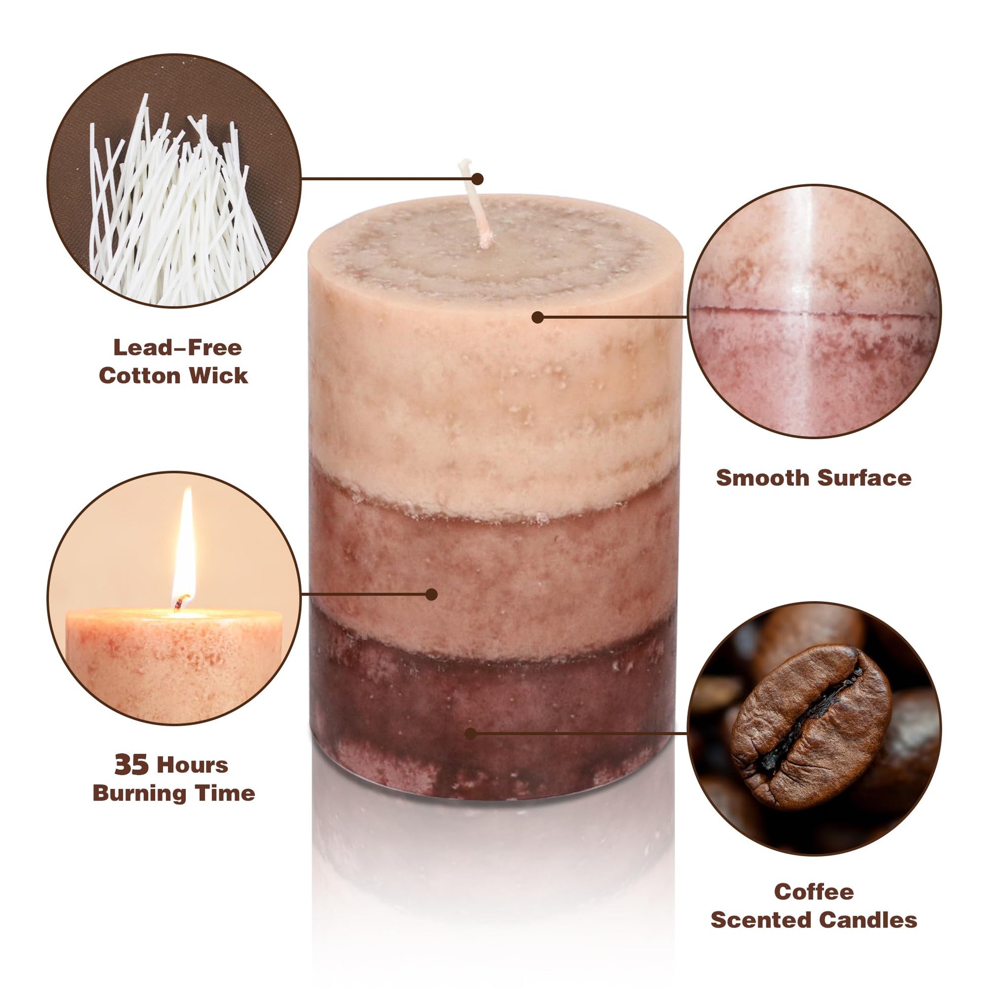 - 【Coffee Scented Pillar Candles】This candle is hand-poured by artisans with premium essential oils extracted from fresh coffee beans, which gives off an intoxicating coffee aroma as the candle burns, as if you were in a cozy cafe. The smell will not be strong enough to make you feel uncomfortable, and the wick is made of 100% candlewick cotton, no smoke and no drips.