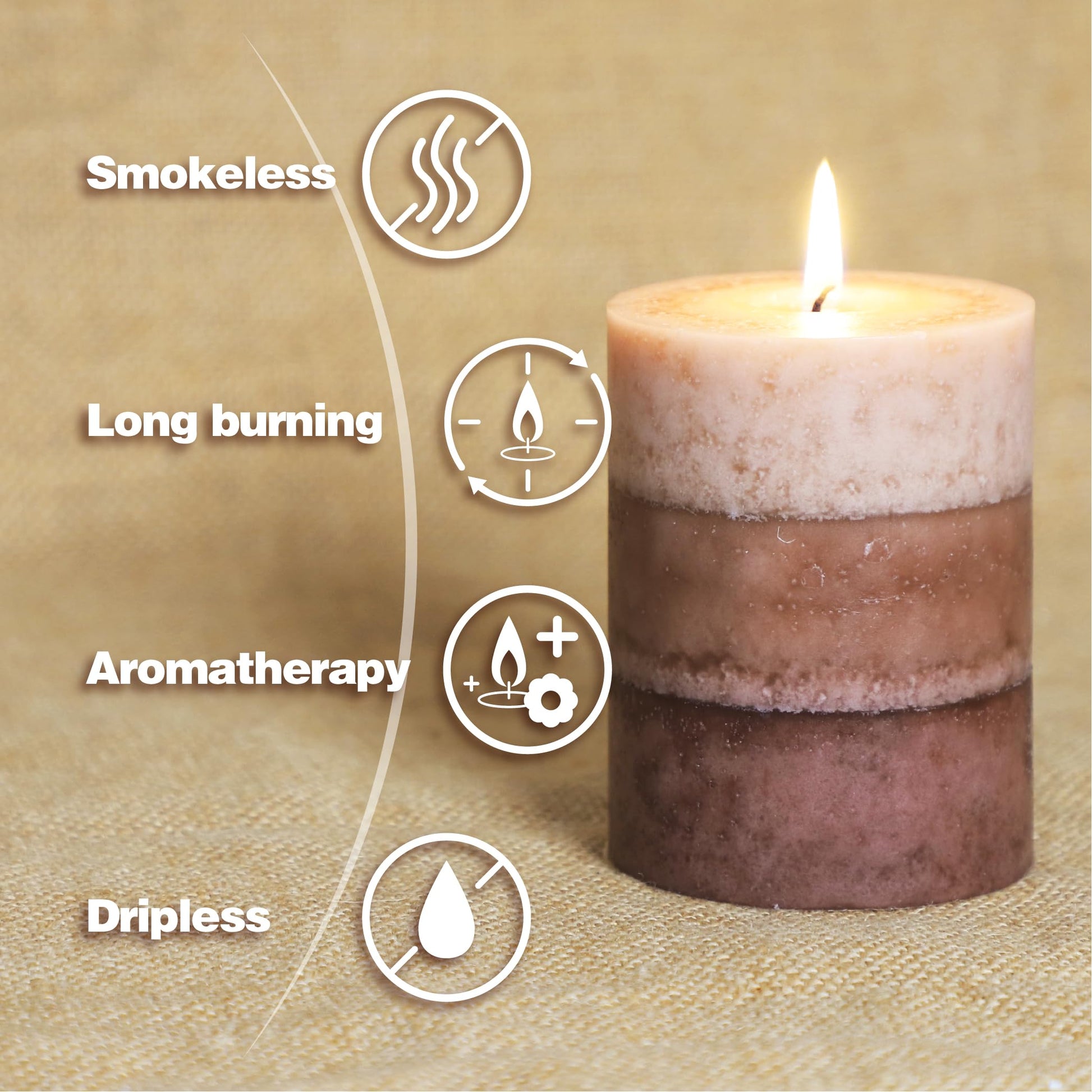 - 【Burning Time】 he size of each aromatherapy pillar wax is 3 x 4 inches, and there are three in total. Each stick burns for up to 35+ hours, for a total of 105 hours per set.