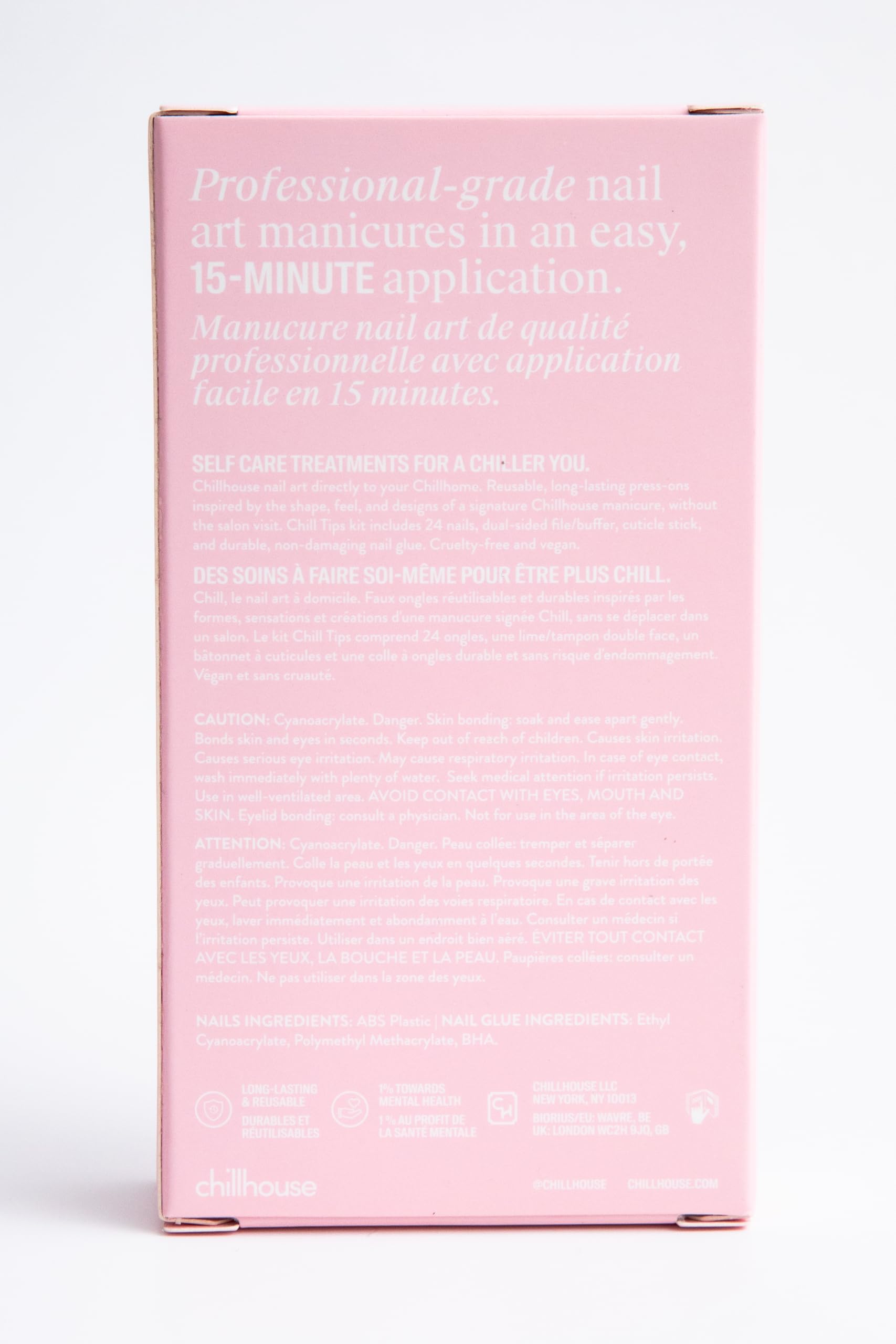 - Modern Press-On Nails: Made with high-quality materials, Chill Tips are comfortable and easy to use from start to finish. The included tools allow you to fully customize the tips to your nail, while the gentle, non-damaging glue secures everything in place for results that have the look and feel of a classic gel mani. Chill Tips are salon-quality nail art that you can do in your home or on the go. There's no mess, no wait time, and no smudges, so you have more me-time.