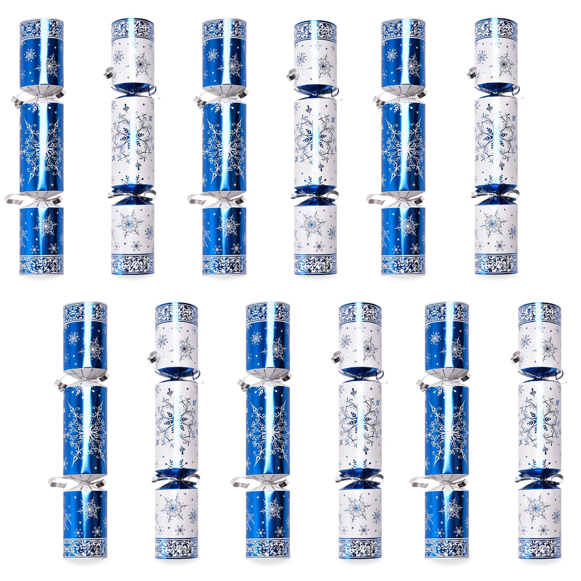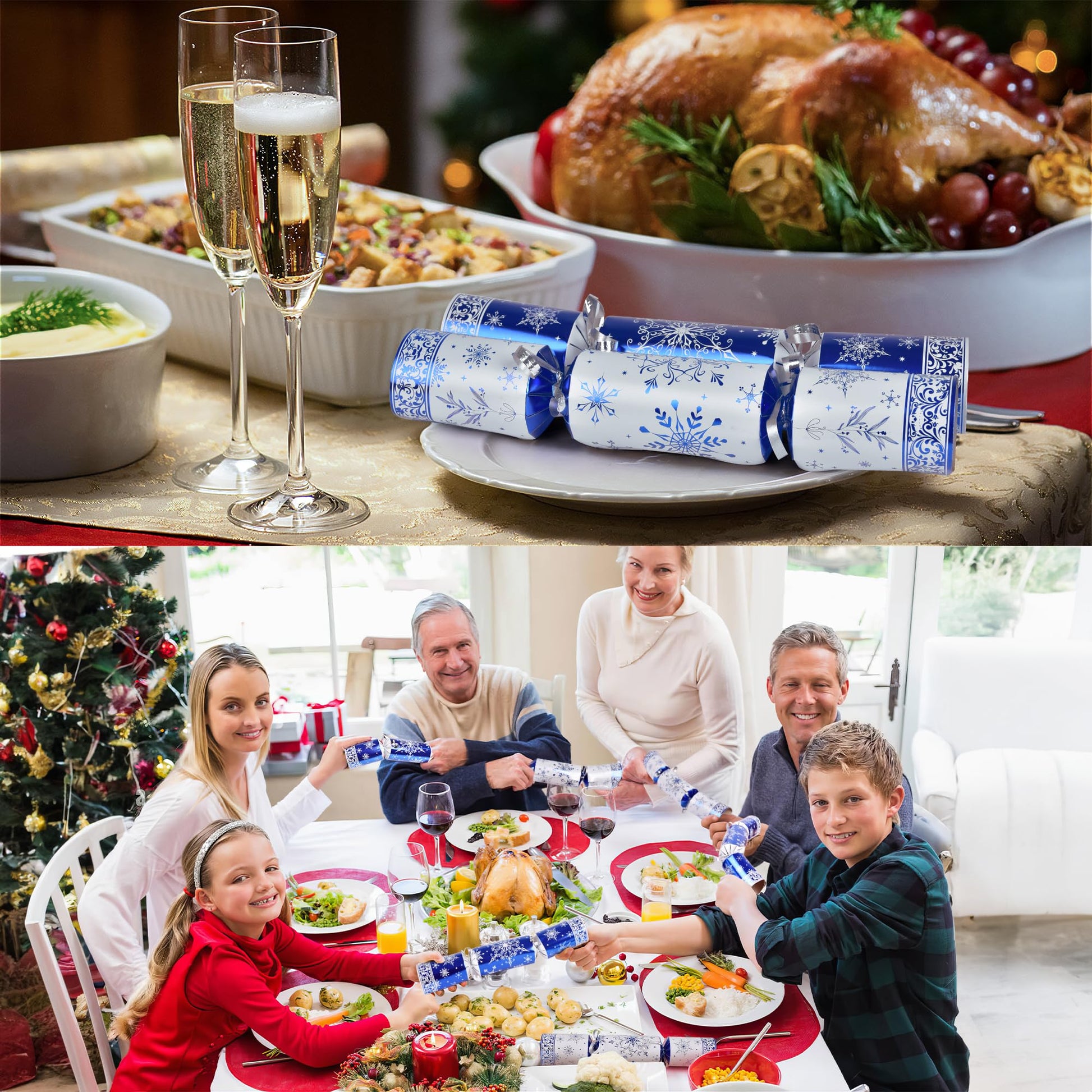 Christmas Crackers, 12 Pack Valentines No Snap Party Favors with Party Hat, Joke & Little Gift Inside for Christmas Thanksgiving Seasonal Holiday Dinner Traditions (Blue and White)