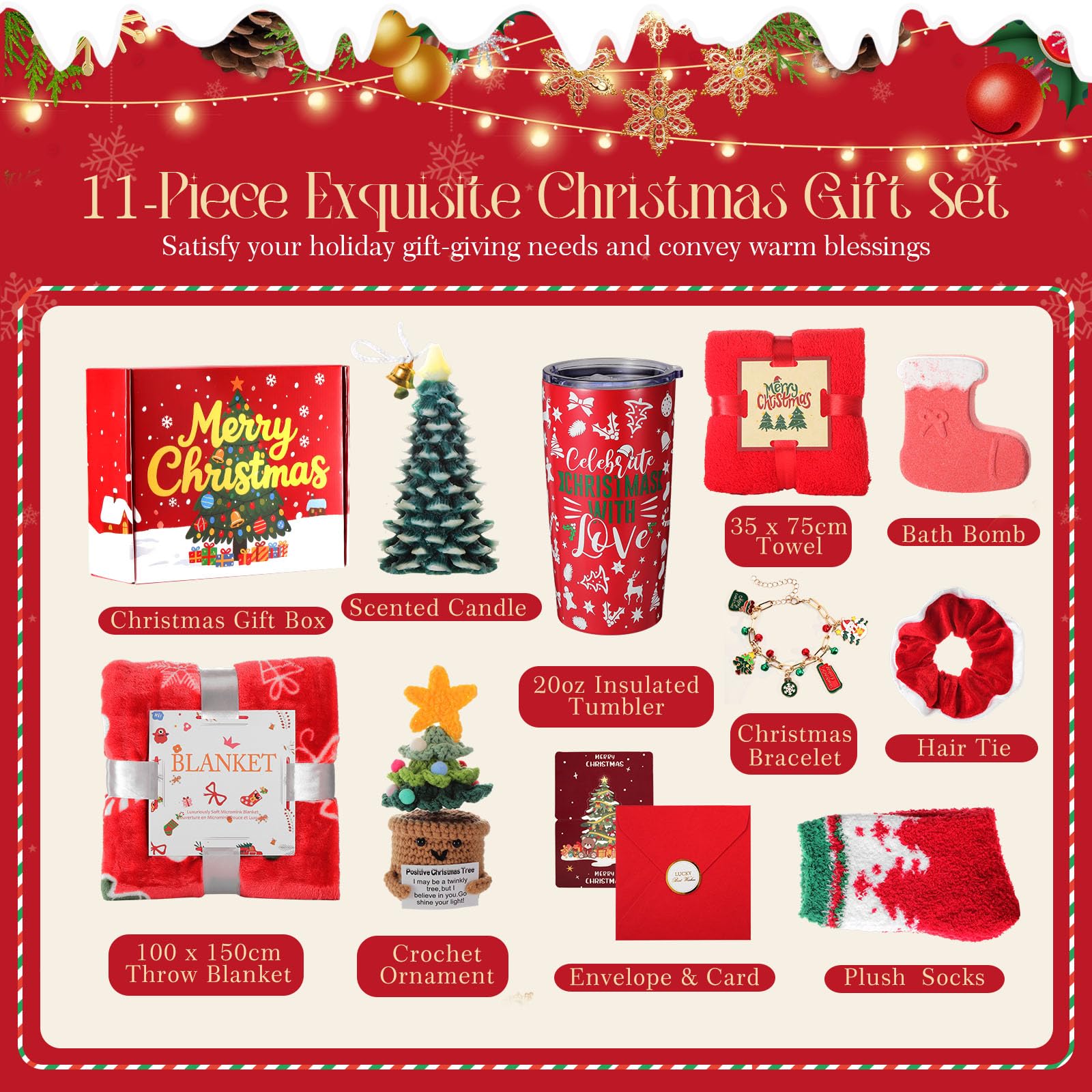 - AMAZING CHRISTMAS GIFT SETS FOR WOMEN: Our Christmas gift sets featuring 20oz stainless steel tumbler with the words 'Celebrate CHRISTMAS WITH Love', Christmas themed throw blanket, festive red towel, plush tree socks, Christmas cedar scented candle, soothing Christmas sock shaped bath bomb, Christmas tree crochet ornament, Christmas themed bracelet, red and white hair tie & Christmas tree shaped card. All this women gift sets Christmas is carefully sealed in a “Merry Christmas” luxury and durable Christmas gift box
