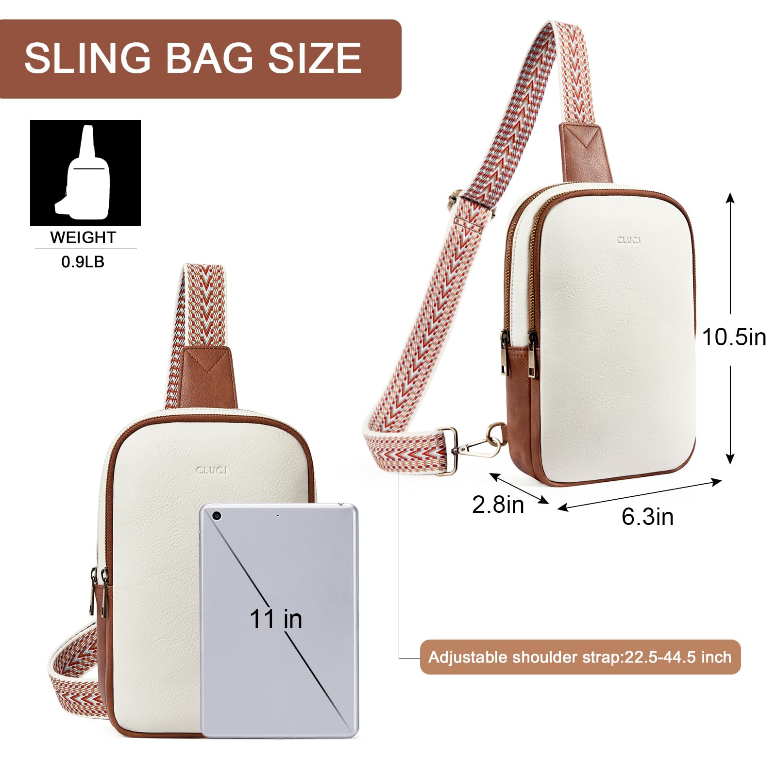 - Functional Size: SIZE: 10.5' * 6.3' * 2.8β, WEIGHT: 0.9LB. The adjustable strap length is 22.50 to 44.50 inches. The sling bag for women crossbody purse is the right size for all kinds of outings, great for keeping your hands free and giving you the freedom to move around while still carrying everything you need.
