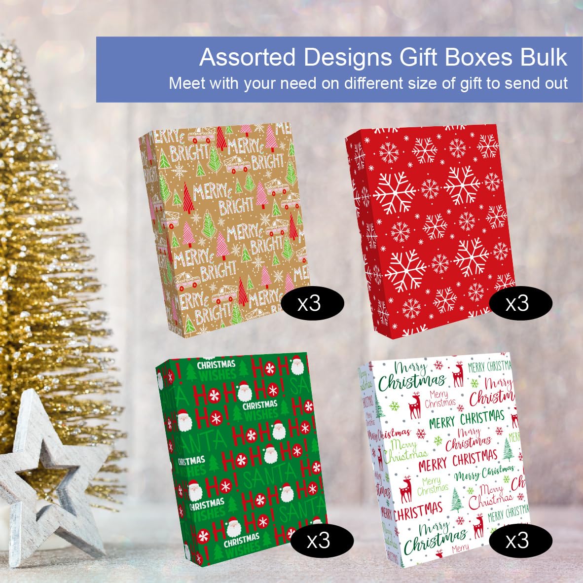- VALUE PACK CHRISTMAS GIFT BOXES WITH LIDS - Each gift boxes bulk pack comes with 12 boxes with lids and all in 17 x 13 x 4 inches. There are 6 fantastic Christmas designs assorted and each design with 2 boxes.