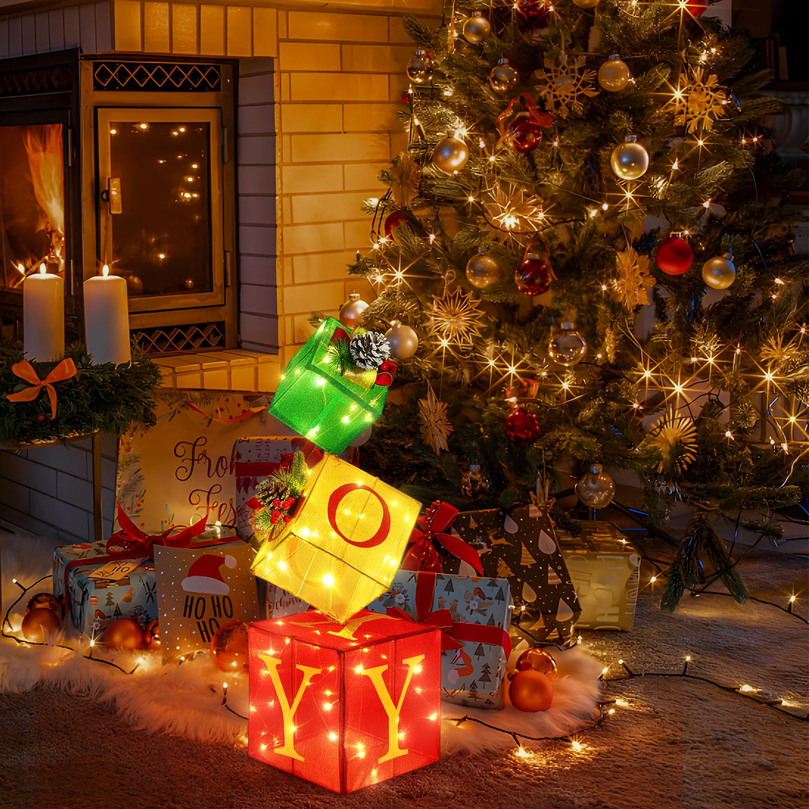 COVFEVER Christmas Joy Lighted Gift Boxes Decorations Set of 3, 2.8Ft Stackable Christmas Nesting Boxes Battery Operated for Home and Party Decoration