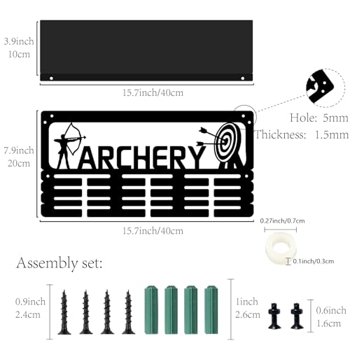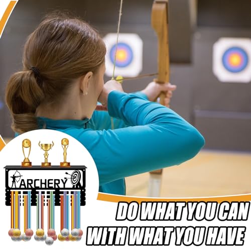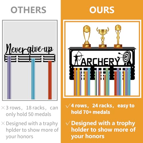- [MEDAL HANGER WITH SHELF]: Medal holder with archery as the theme. Designed with a trophy holder to show more of your honors. The composite medal display rack can not only hang your medals but also place trophies, with large capacity and convenient practicality.