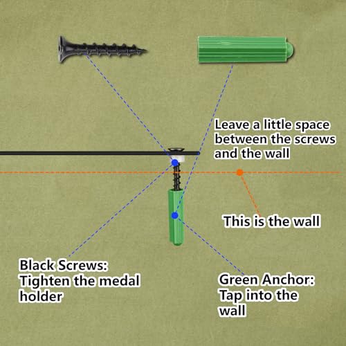 - [EASY TO INSTALLATION]: ① Mark the screw location with a pencil. ② Use a power drill (5mm drill bit) to make holes for the wall anchors. ③ Tap the green anchor gently into the wall with a hammer. ④ Tighten the screw inserted into medal holder and green anchors.