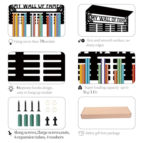 - [METAL MEDAL HOLDER]: The medal hangers is made of premium iron, 4 rows, 24 racks, easy to hold 70+ medals, super loading capacity up to 5kg/11lb, sturdy and durable, not easy to bend, not bulky, not easy to rust, easy to wipe and clean.