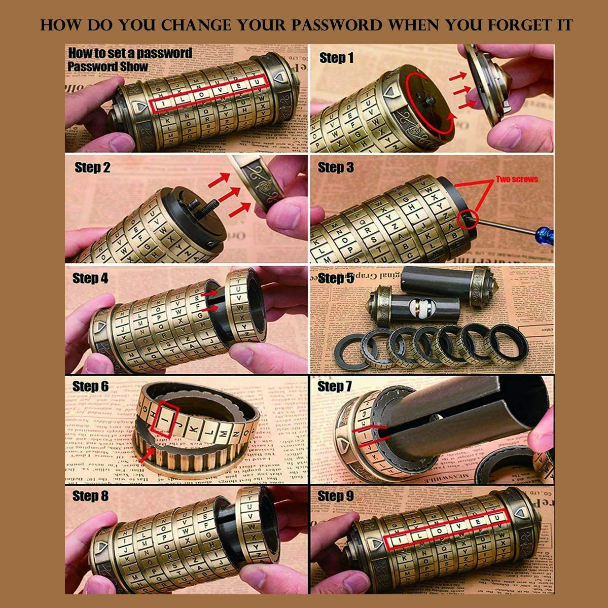 - 【EASY TO USE】Password setting: The default password of the cryptex is I LOVE U, you can also set your own password. We provide steps and tools to modify the password, which is very simple. You can play a detective game with your partner or children and provide different clues for the other party to analyze the password and get clues. This kind of puzzle game not only trains thinking ability, but also promotes your feelings.