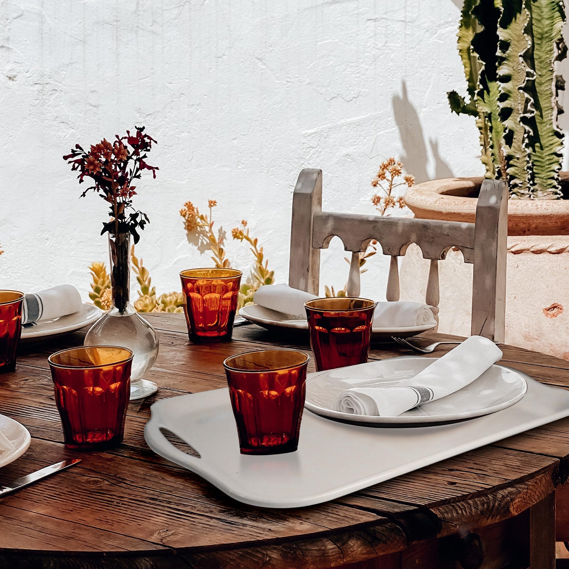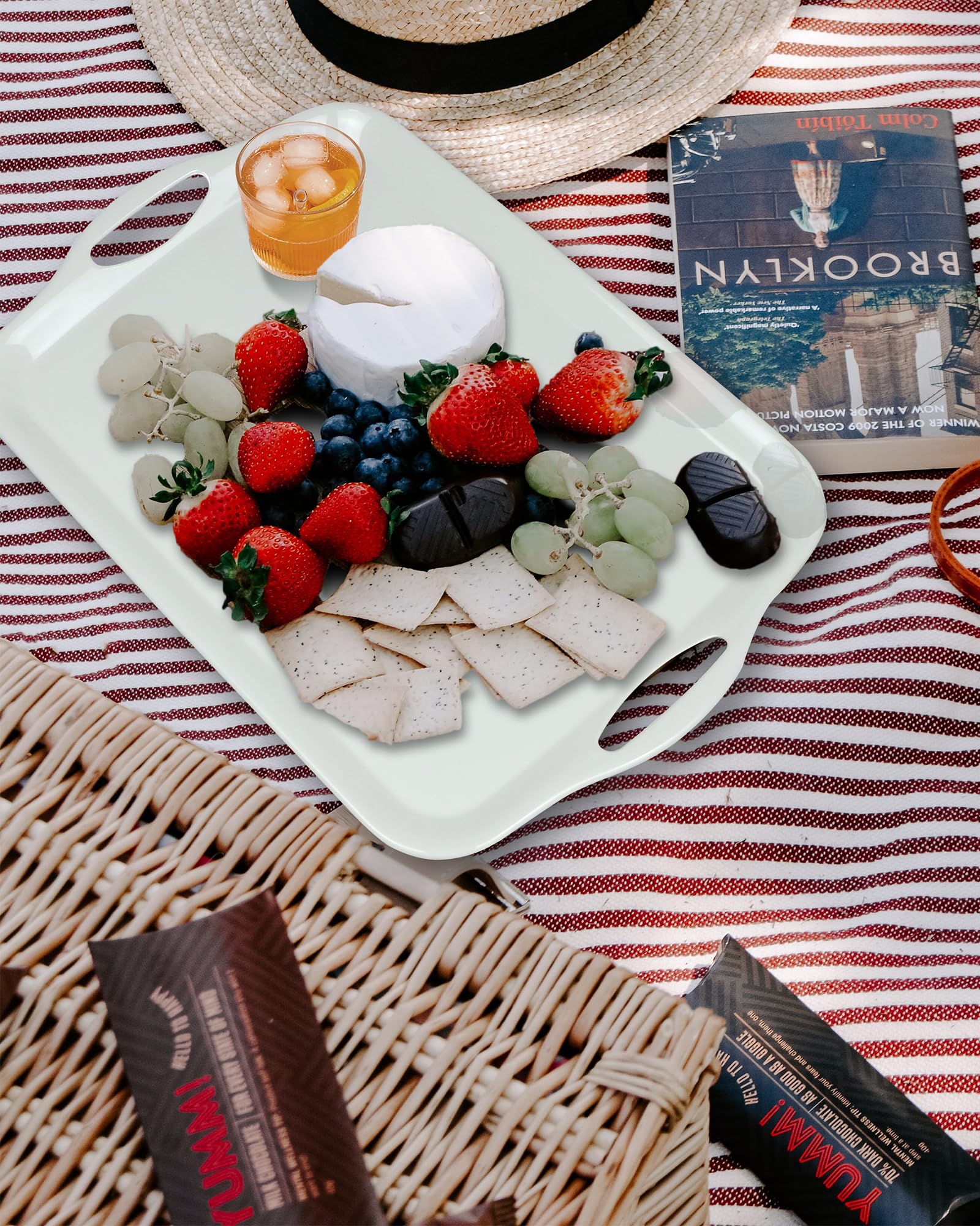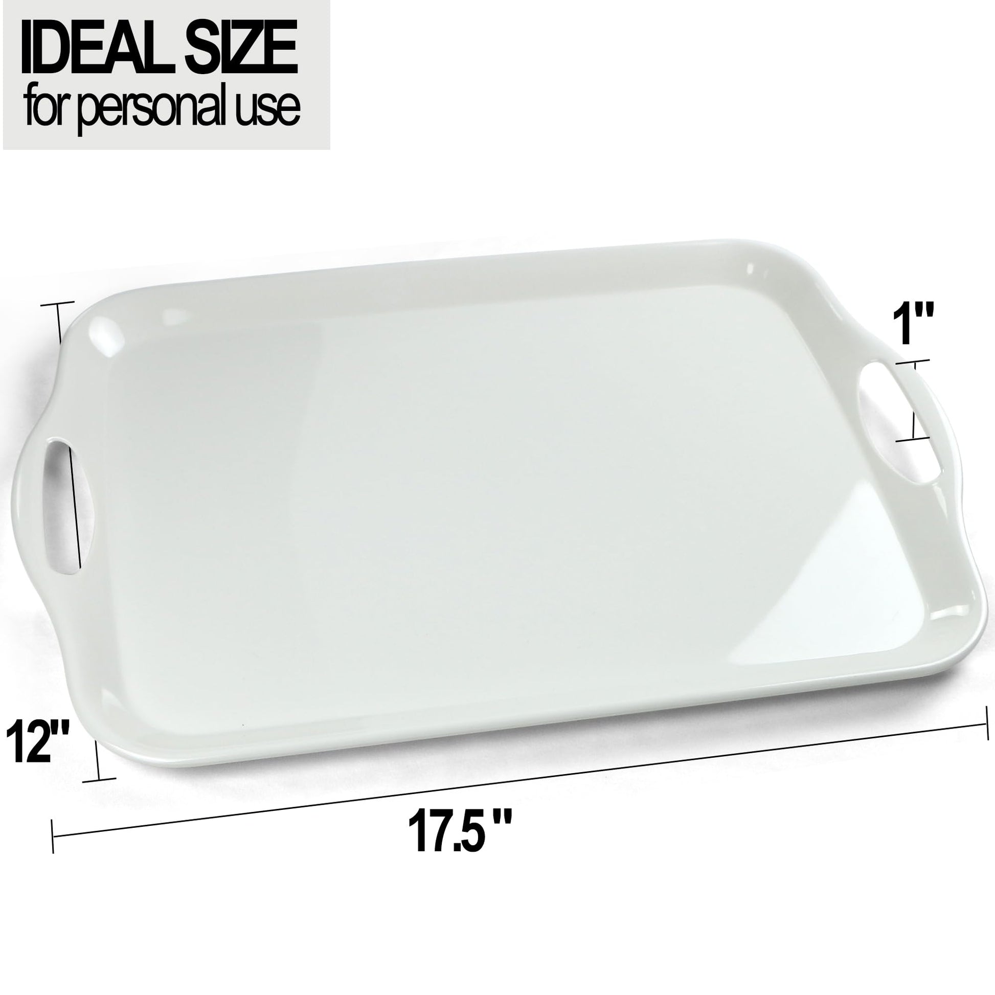 - IDEAL FOR PERSONAL USE: With a smooth finish craftsmanship, this melamine platter is extremely easy to wash, anything on the surface rinses right off with ease and no staining left, great size with smooth handles to eat food in bed, holding a plate and keeping tray on the lap, stack nicely without taking up too much space
