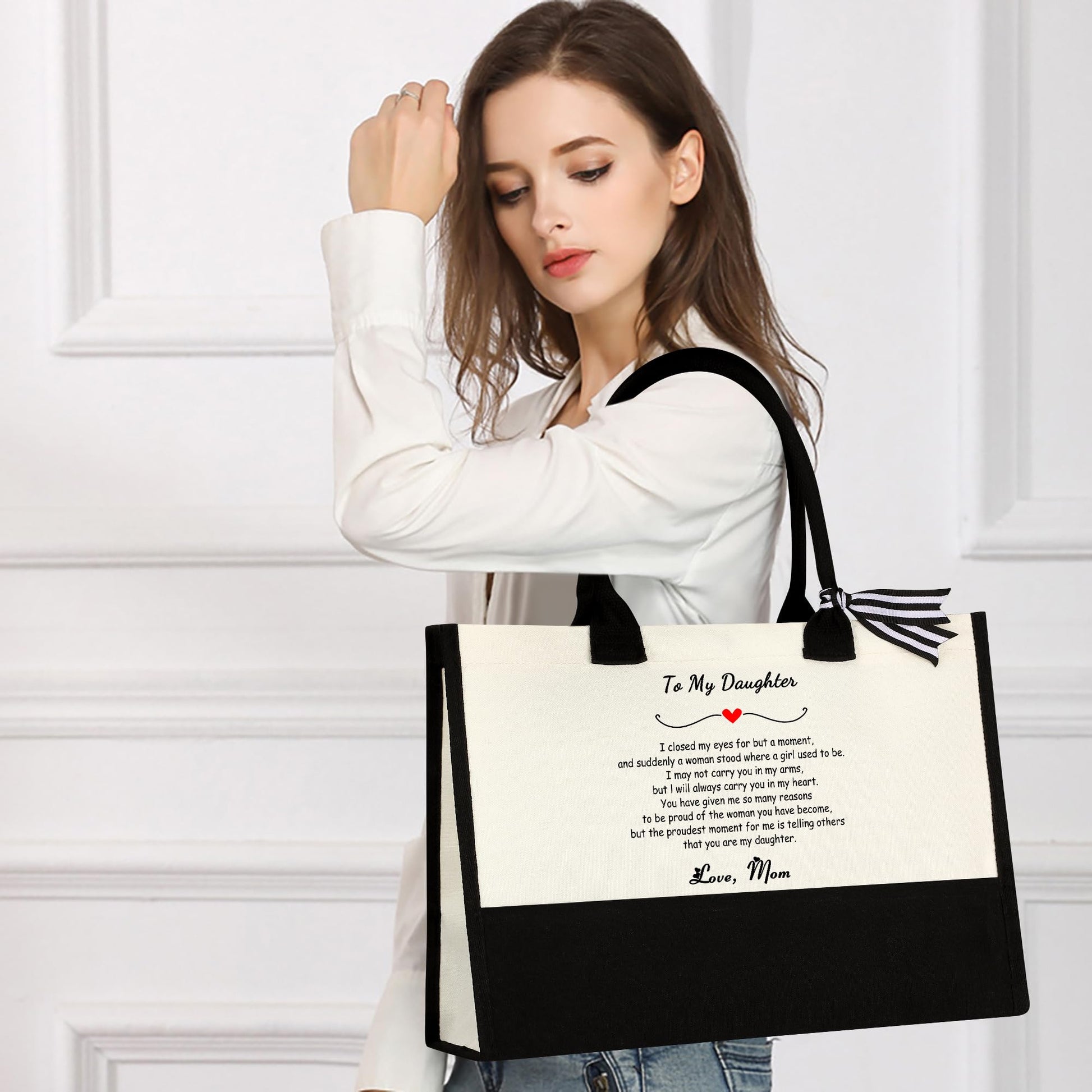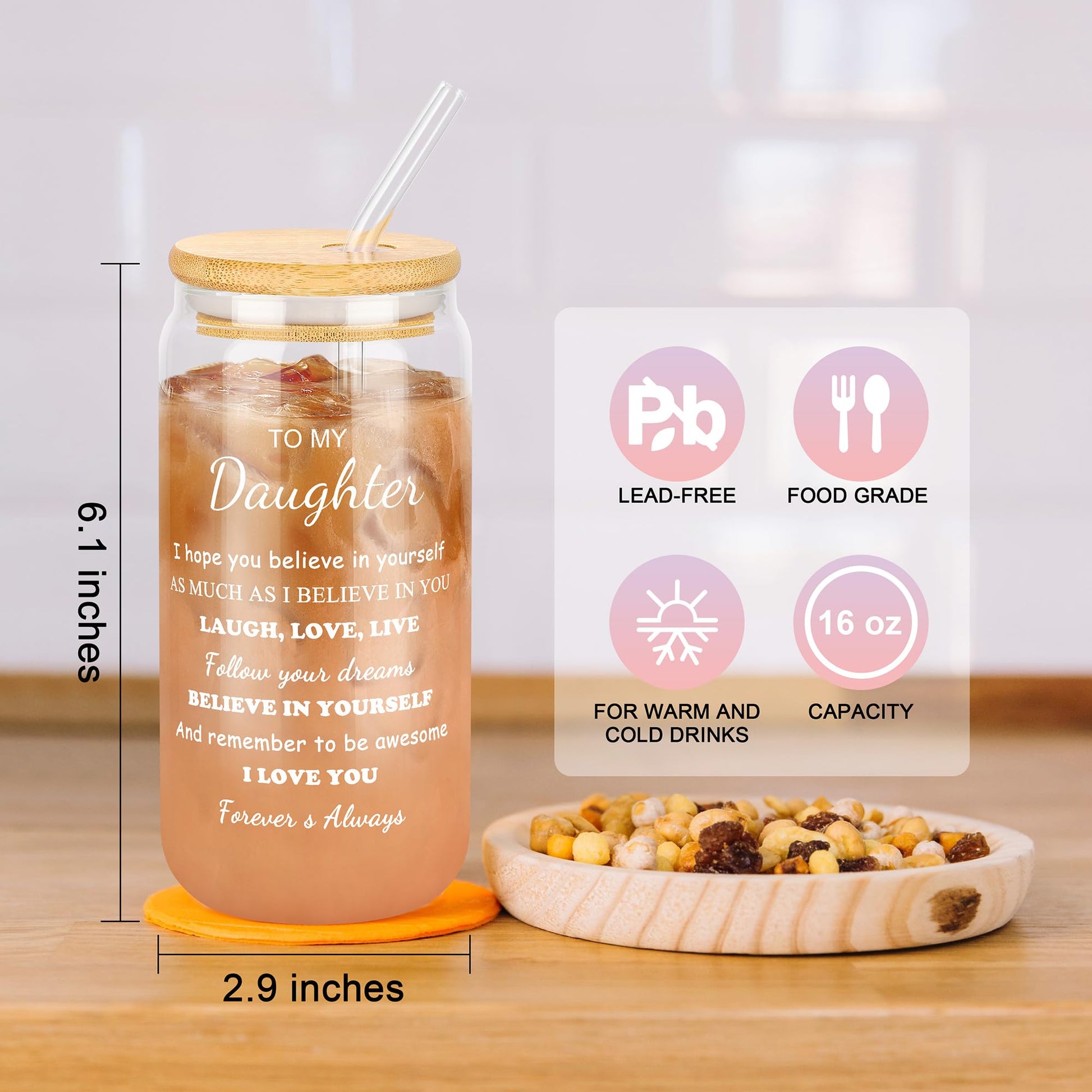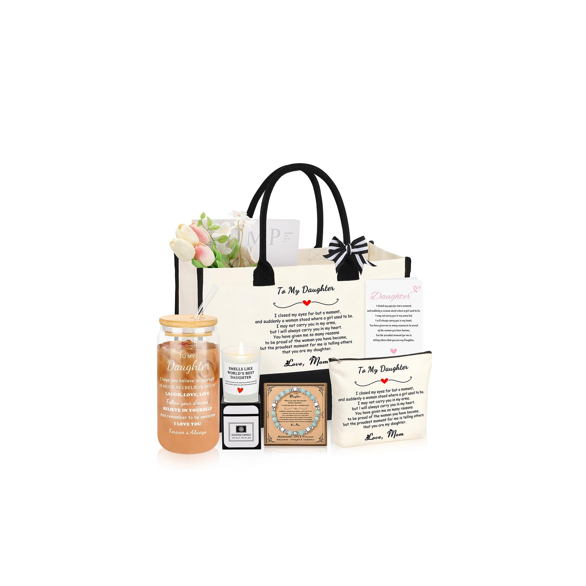 - 【Daughter Gifts Basket Contains】6 items in this gifts set have been handpicked by us which contains 1 stylish tote bag, 1 practical canvas makeup bag, 1 16 Oz glass cup with lid and straw, 1 cute amazonite bracelet, 1 soy wax Lavender scented c**dle and 1 greeting card to write what you want to say. Show your love to your lovely daughter with this thoughtful gifts set!