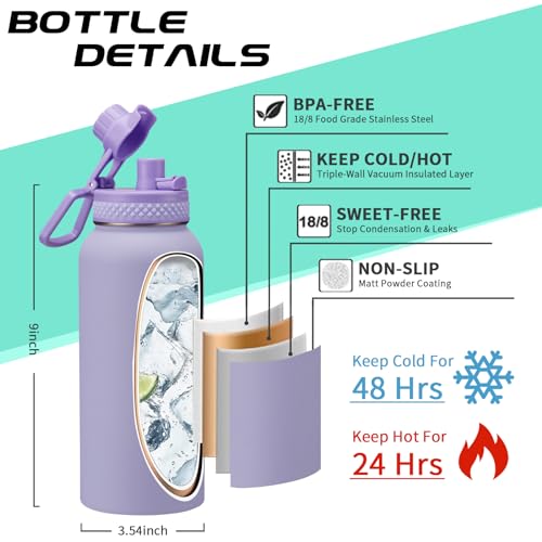 - QUALITY VACUUM INSULATION: Stainless Steel water bottle featuring double-wall & food-grade 18/8 stainless steel with superior insulation & anti-condensation, keeping your beverages stay ICE COLD for 48-Hours & HOT for 24-Hours for a fresh taste. In addition, the outer layer with non-slip powder coating ensures drinking bottles won't sweat & that keeps it from slipping