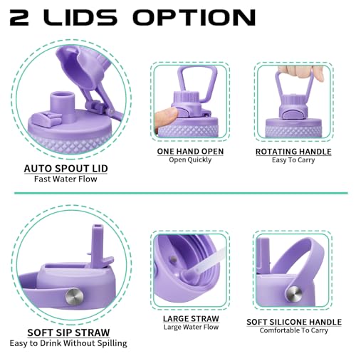 - 2 LEAKPROOF LIDS OPTIONS: The auto spout cap & straw lid provide your different drinking experience. The ONE-HAND operation pop-up spout lid for easy enjoy your fast water flow. The SPILL-PROOF straw lid with high flow rate & BPA free. Both 2 lids design with a sturdy handle, making the Hydrogen flask water bottle more convenient to carry