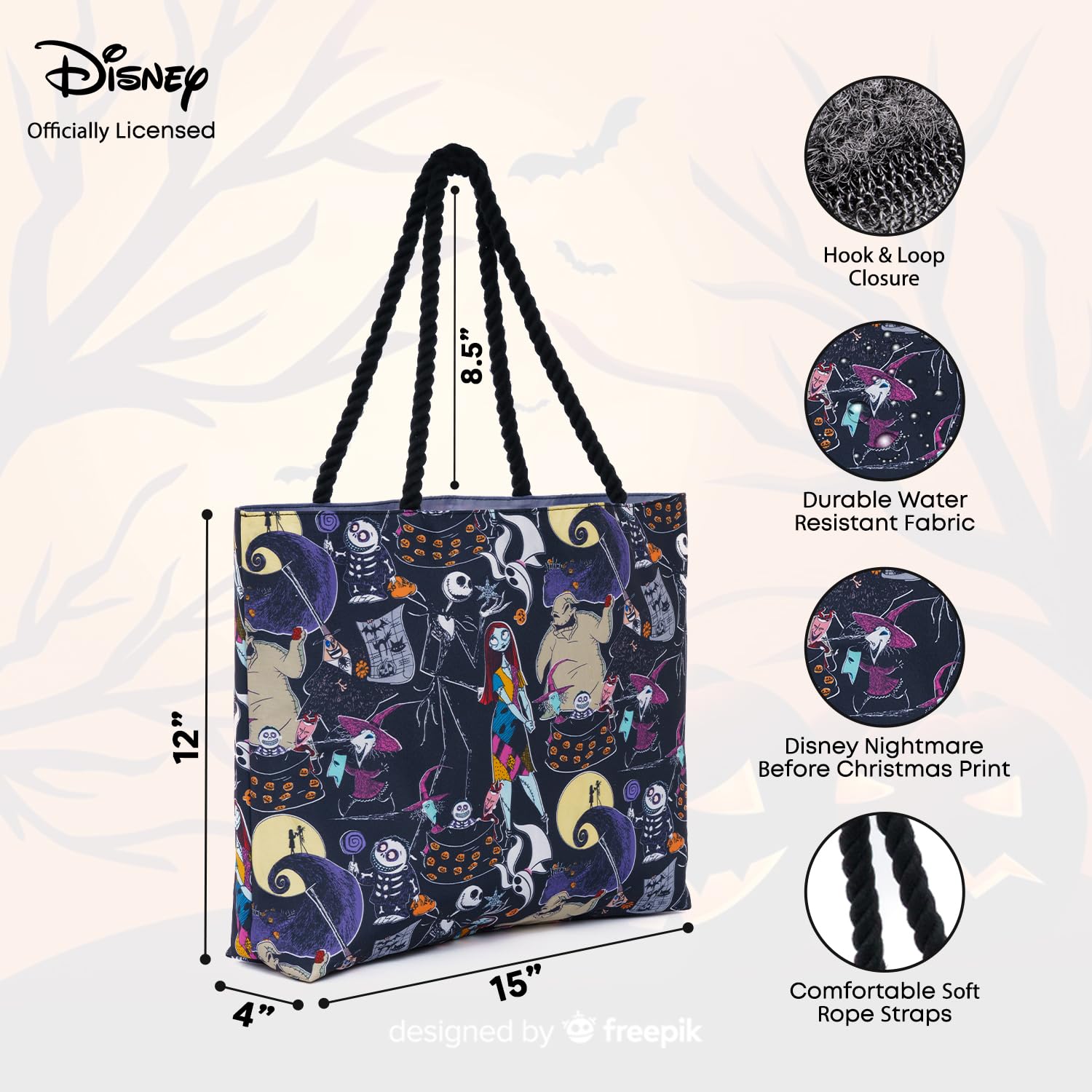 Disney Nightmare Before Christmas Tote, Jack Skellington Sally Zero Print, Large Water-Resistant Canvas Bag, Halloween Town Accessory, Work, Travel Carry-All for Women