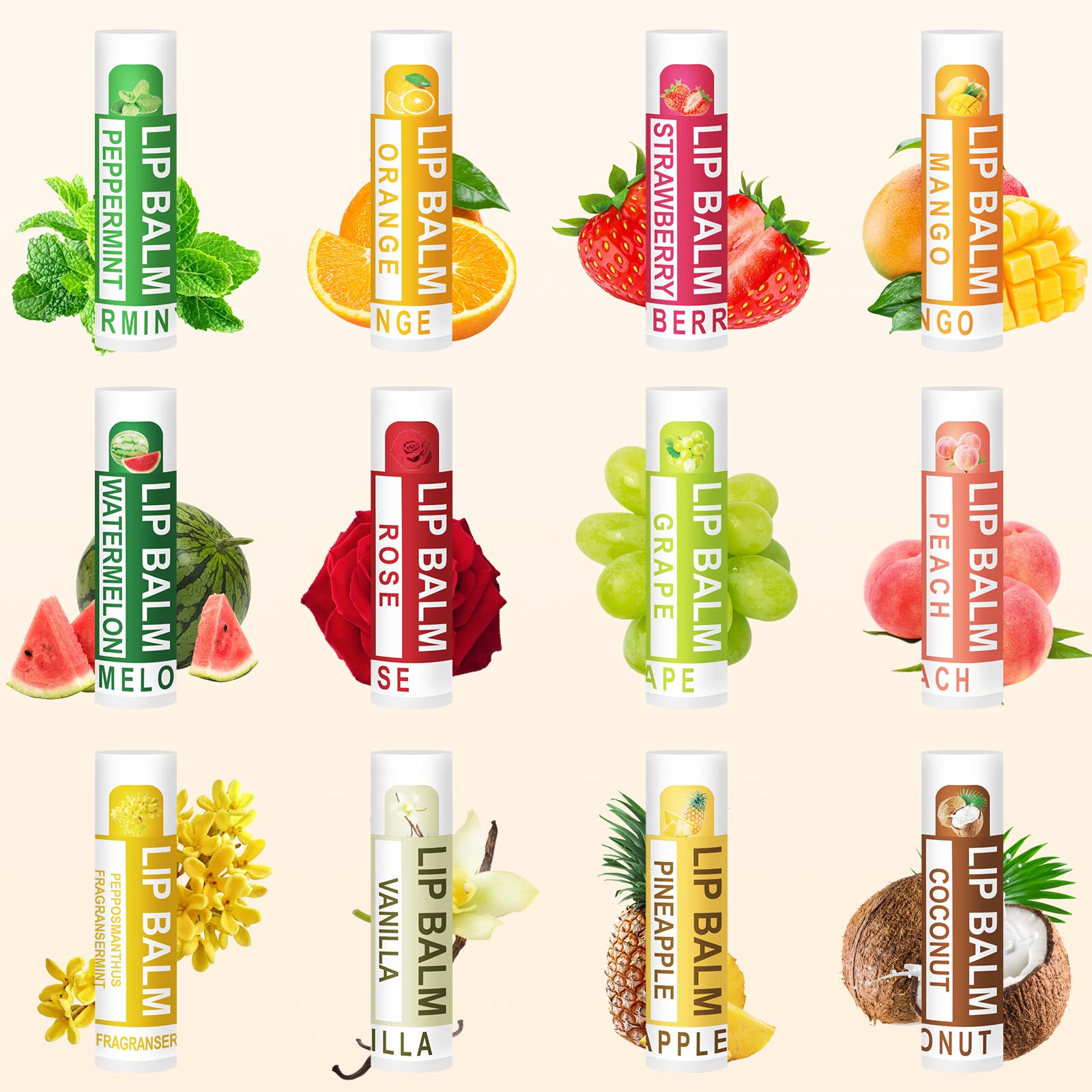 - Flavored Lip Balm: Lip balm set of 60 tubes, featuring 12 delightful flavors (Strawberry, Watermelon, Mango, Coconut, Mint, Pineapple, Rose, Osmanthus, Grape, Peach, Orange, Vanilla), this collection is the PERFECT gift for anyone