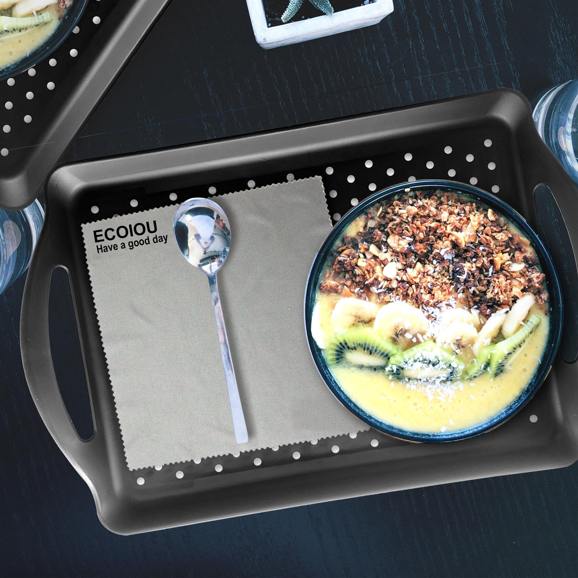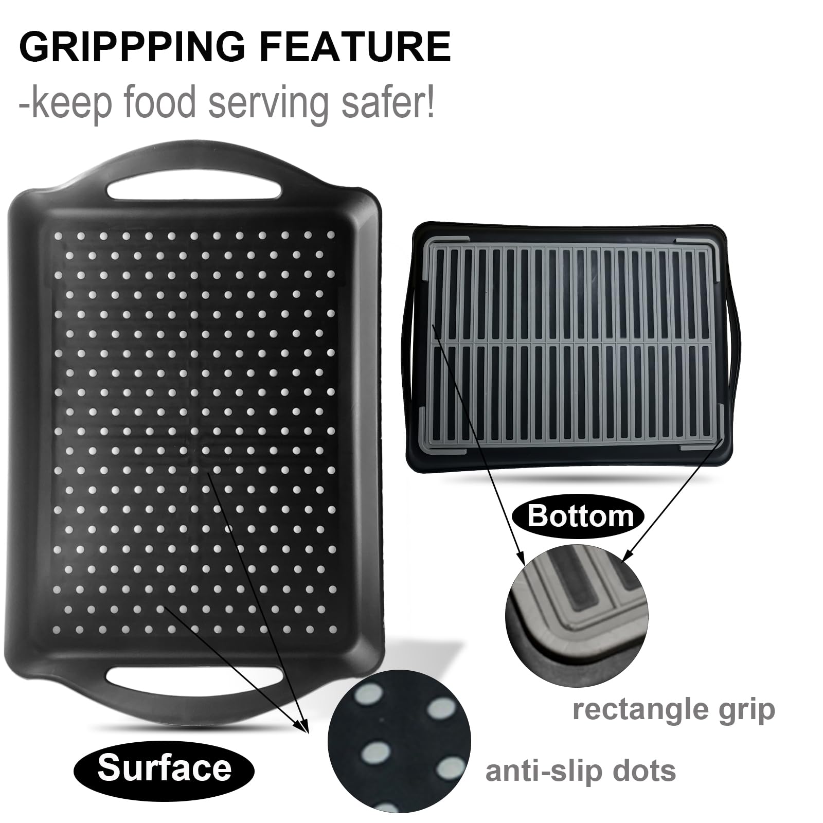 ECOIOU Non Slip Food Serving Tray with Handles, 2-Pack Rectangle Anti-Slip Non-Toxic Dishwasher Safe Tray for Snack Fruit Dessert Breakfast Drink (Black)