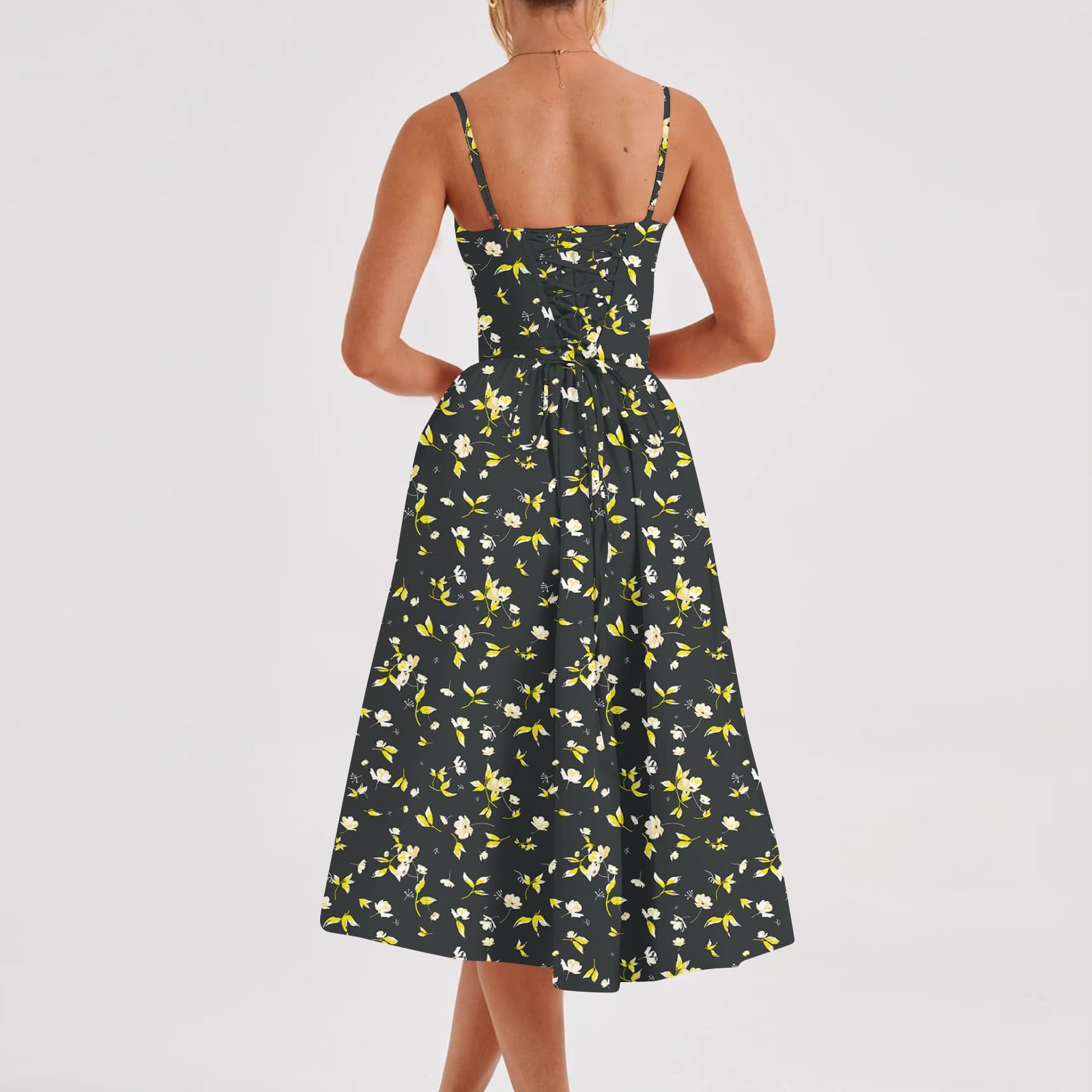 Elegant Cocktail Dresses for Women Summer Spaghetti Strap Bustier Midi Dresses Flowy Pleated Hem Low Cut Sundress with Pockets Womens Corset Dress Formal Mother of The Bride Dresses for Wedding