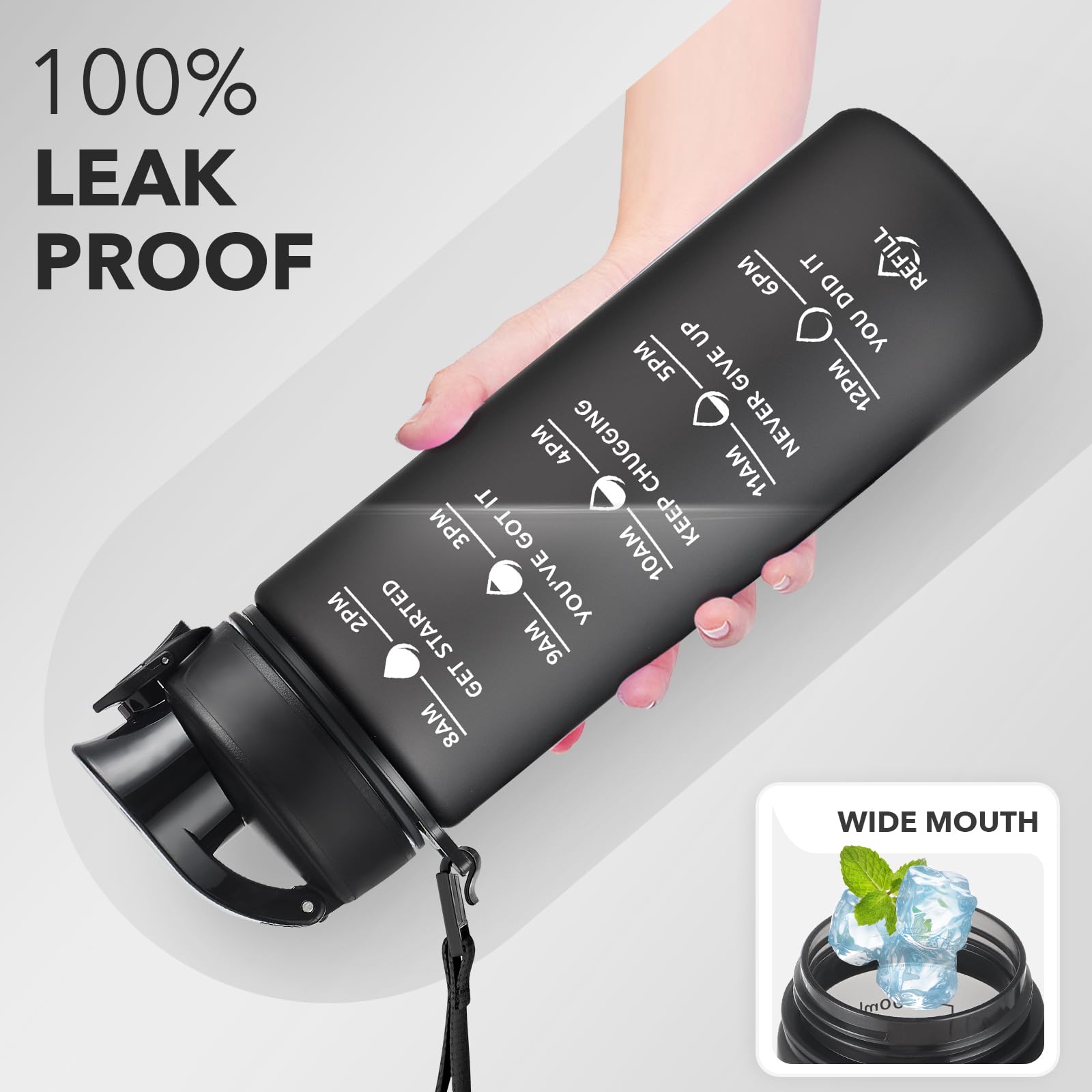 - 【Humanized Design】Water bottles with times to drink can quick open with one hand. The flip-top lid is used a secure lock, making it dust-free and leak-proof. Time water bottle is portable, light, and easy to use.