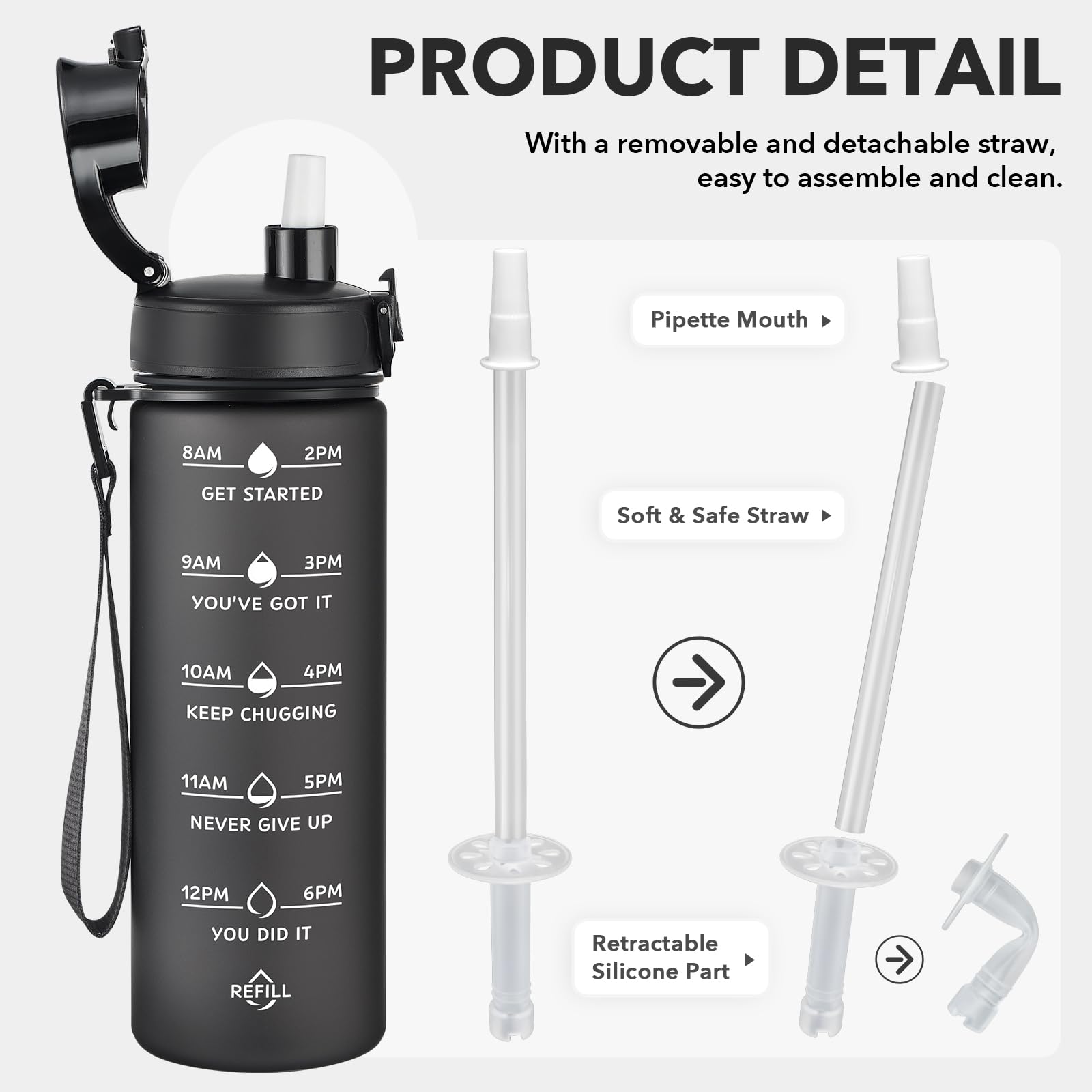 - 【Two Ways to Drink】Through the upgraded, motivational water bottle has two ways to drink. Equipped with a direct drinking port, drinking water is more enjoyable. One removable straw allows you to enjoy spill-proof sipping.