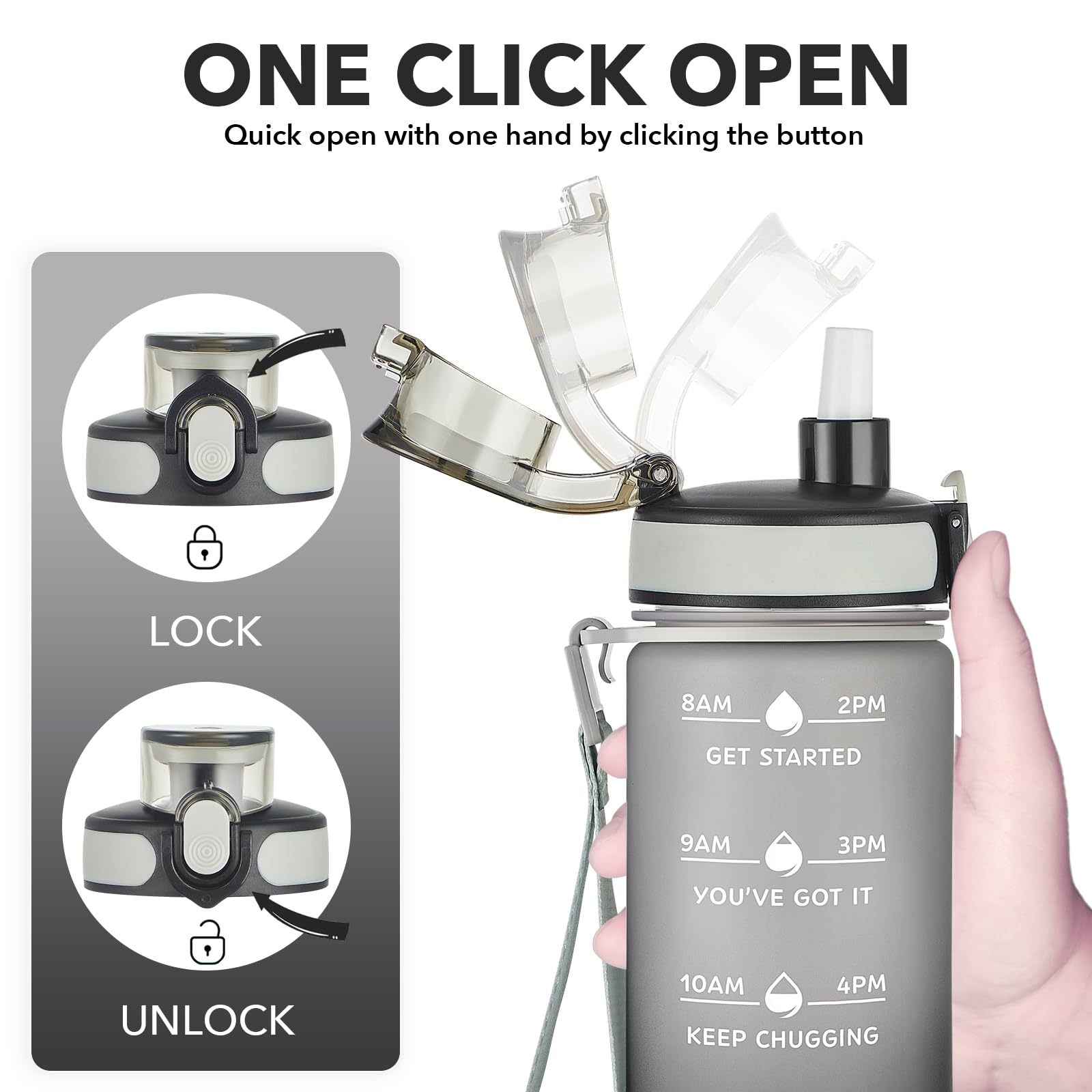 - 【Humanized Design】Water bottles with times to drink can quick open with one hand. The flip-top lid is used a secure lock, making it dust-free and leak-proof. Time water bottle is portable, light, and easy to use.