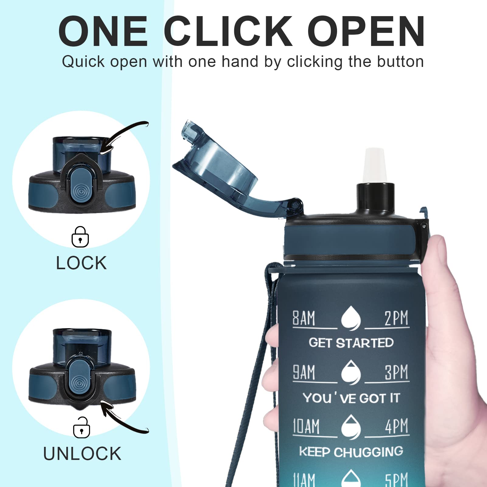 - 【Humanized Design】Water bottles with times to drink can quick open with one hand. The flip-top lid is used a secure lock, making it dust-free and leak-proof. Time water bottle is portable, light, and easy to use.