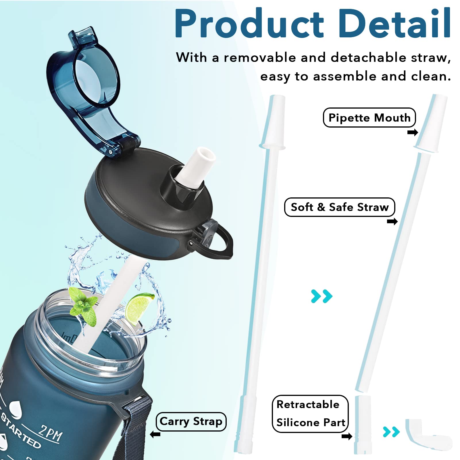 - 【Two Ways to Drink】Through the upgraded, motivational water bottle has two ways to drink. Equipped with a direct drinking port, drinking water is more enjoyable. One removable straw allows you to enjoy spill-proof sipping.