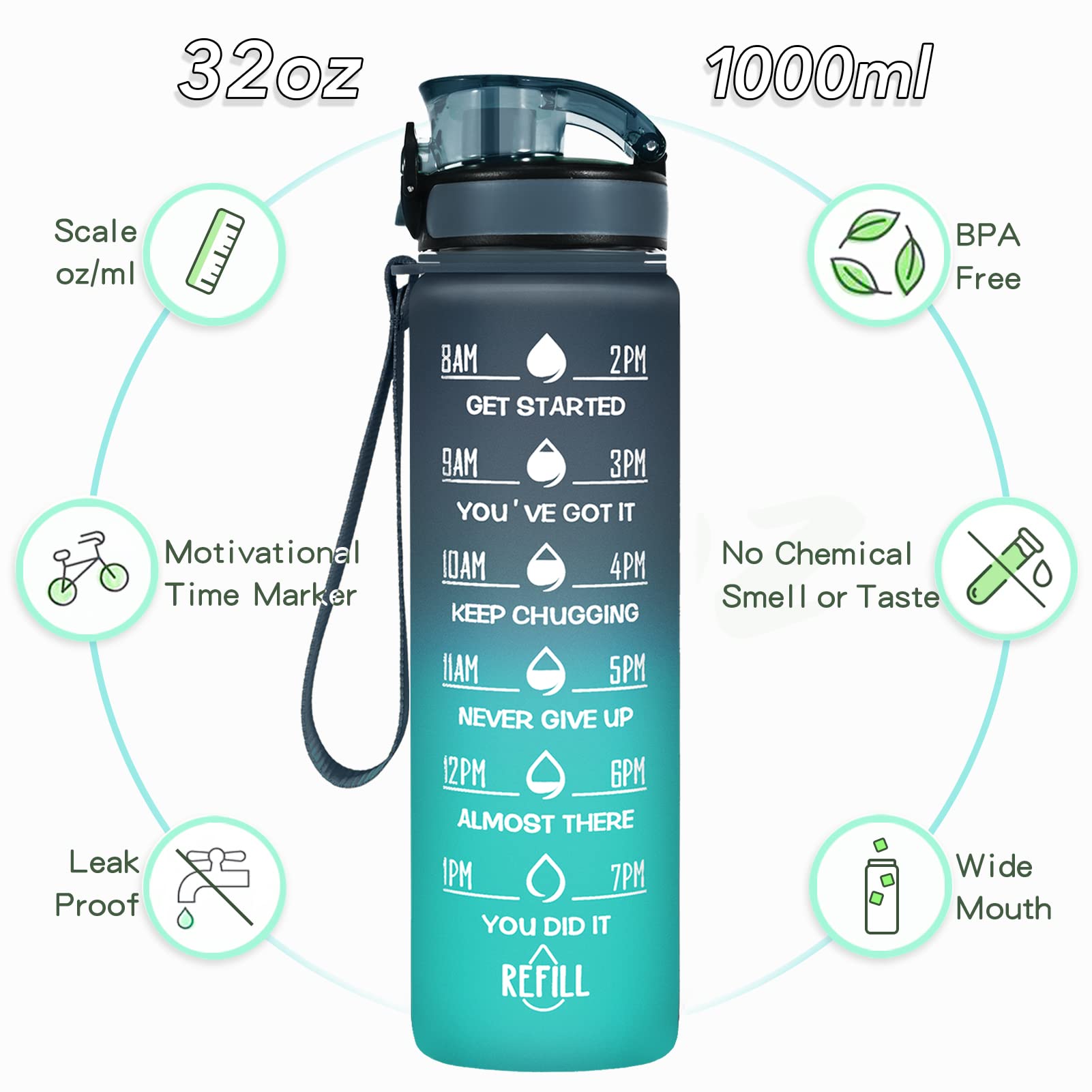 - 【Stay Motivated and Hydrated】32 oz water bottle with unique quote and time marker are inspirational, convenient for tracking your daily water intake and reminding you of being hydrated. Drinking bottles is suitable for any activities.