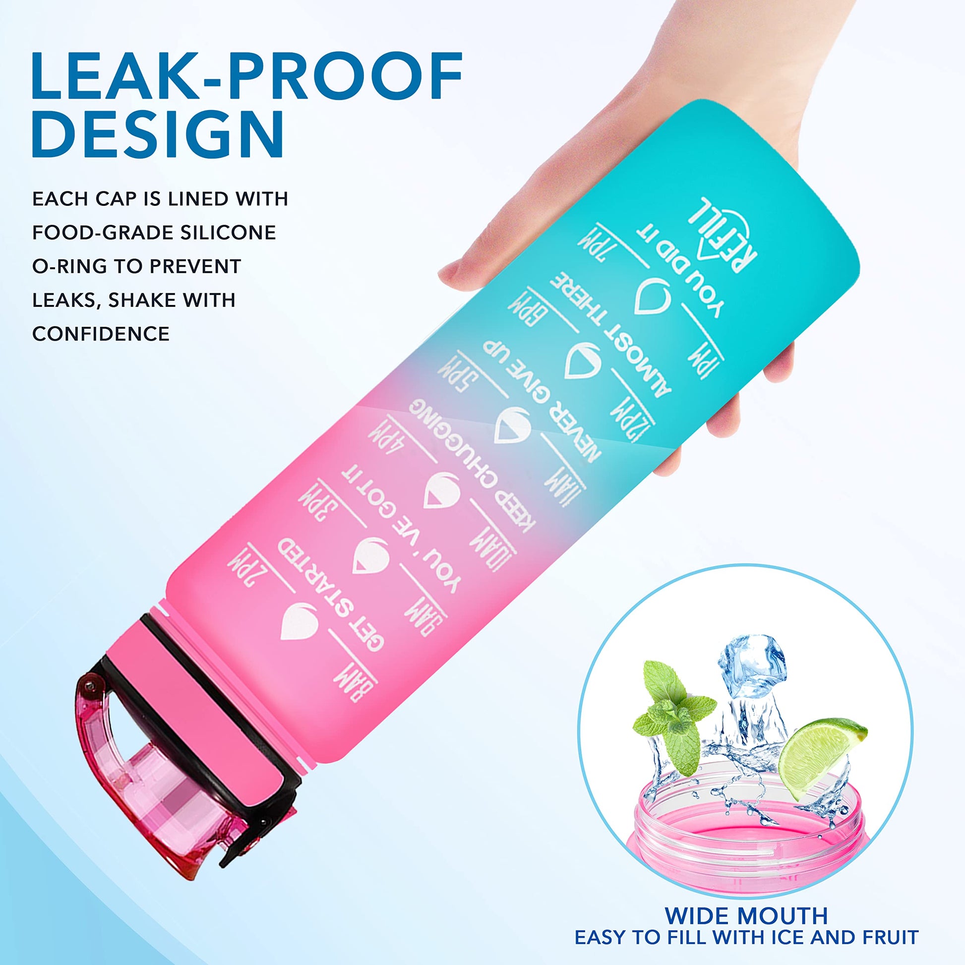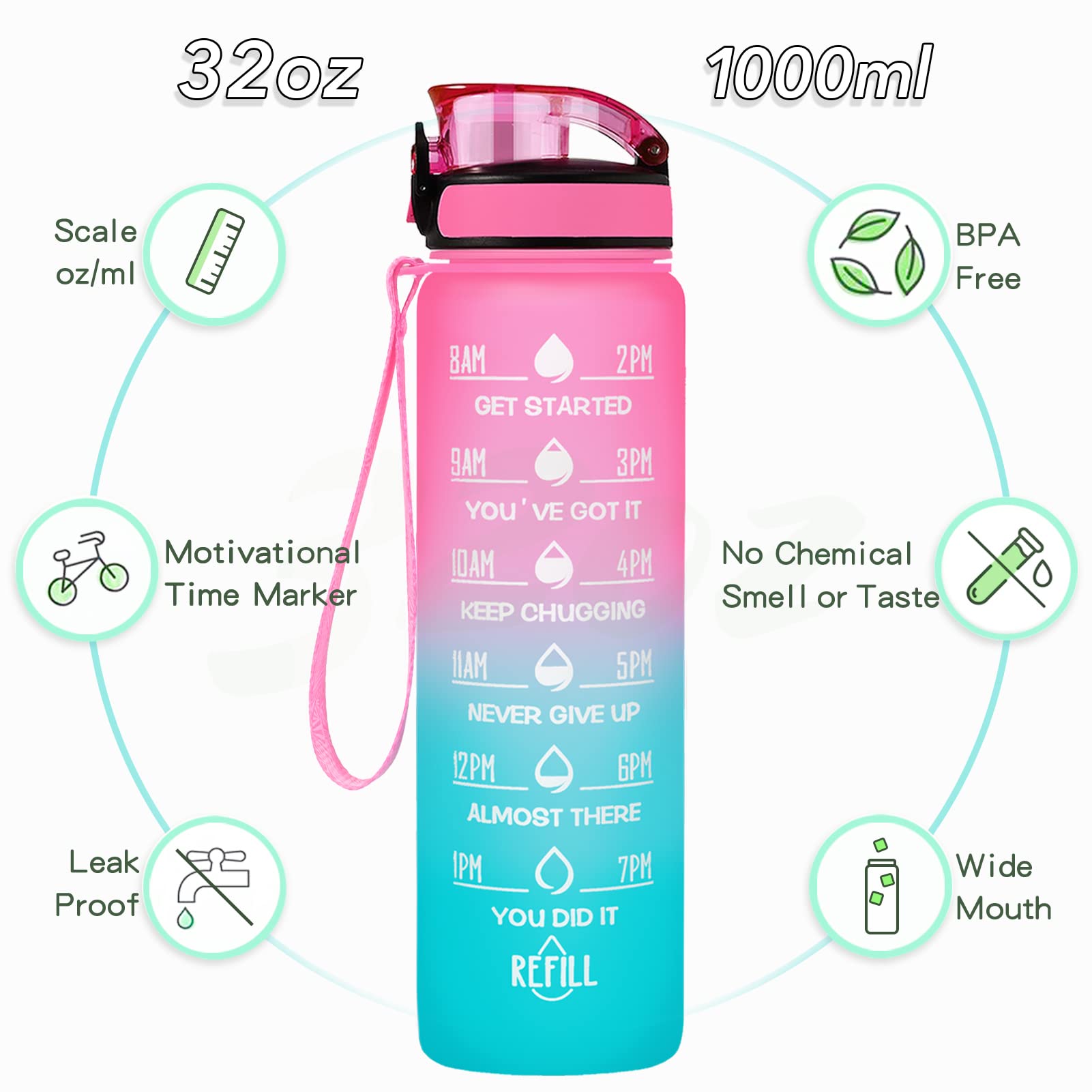 Enerbone 32 oz Water Bottle, Leakproof BPA & Toxic Free, Motivational Water Bottle with Times to Drink and Straw, Fitness Sports Water Bottle with Strap for Office, Gym, Outdoor Sports, Pink-Green