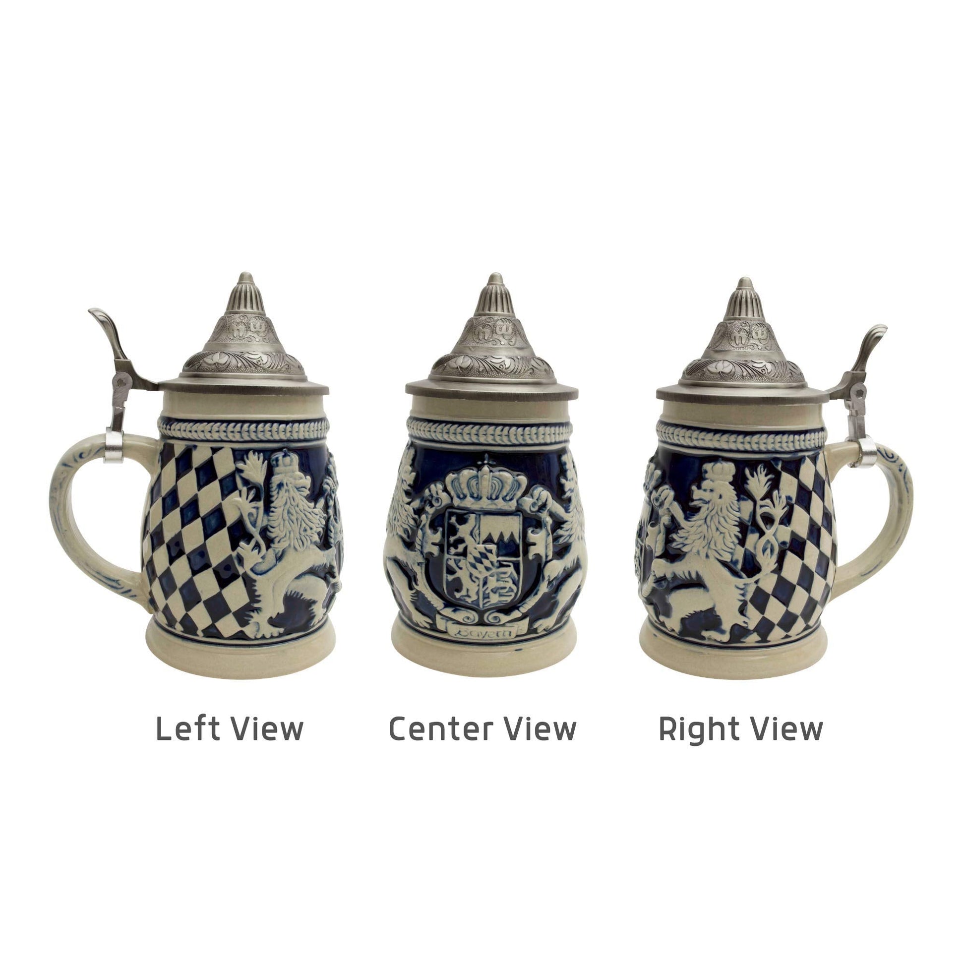 - The Design: This Ceramic Beer Stein holds 0.65 liters and features a decorative engraved hand painted Bayern coat of arms topped off with an Ornate Metal Lid.