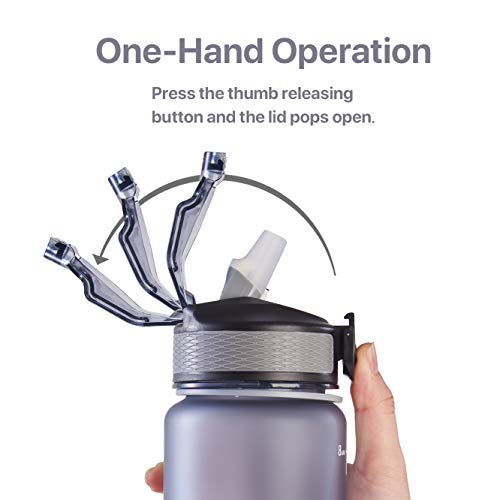 Details: Made of high-quality BPA-free materials that is 100% safe and impact-resistant. Time markers printed in the front quietly reminds you to drink sufficient water for life being. Protective spout cover prevents dirt. Leak-proof locking flip-top lid with one-hand push-button make it easy for you to drink on the go quickly and easily. Soft yet durable carry-strap makes it portable and comfortable to carry.