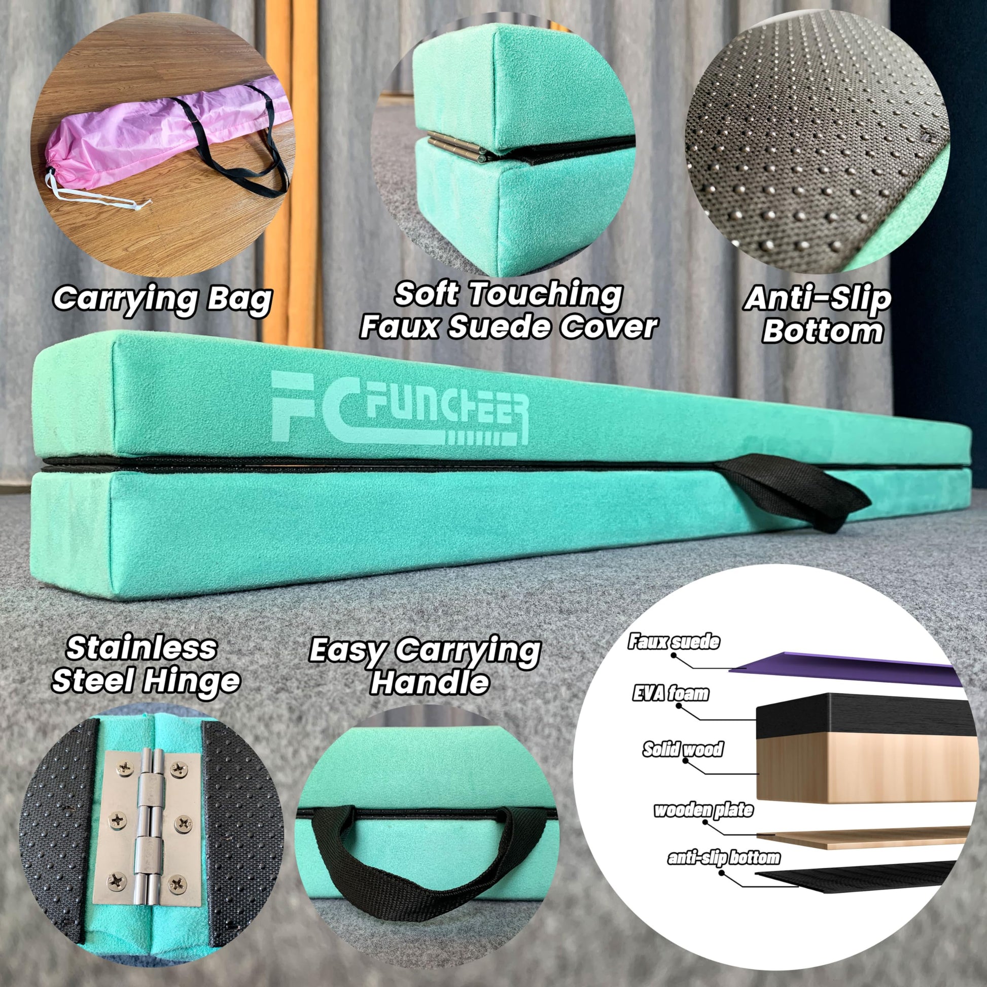 Details: FC FUNCHEER is new and very professional in producing and designing sport equipment such as ,ballet barre and home gymnastic equipment that is well-experienced. Feture Firm wood core structure & stainless steel connection The firm wood core connection offer strong stability structure,the safe design stainless hinge connect the beam more stable for training on it! Popular 8FT in length:The most popular size folding beam just the right size for your home usage. Foldable and light weight:You can fold it up and store it in a closet, corner or basement, and the compact size will only take up very little storage space.and the light weight can just move and carrying very easiliy by the kids. Anti-slip bottom & easy carrying handle:The anti-slip bottom make the beam more stable on the floor that will not move for your usual training.and the carrying handle is so easy to take anywhere. Build Strength & Confidence: This beam is suitable for all level skill performance training from beginner gymnasts for walking, playing and practicing on a raised balance beam to athlete doing professional training.