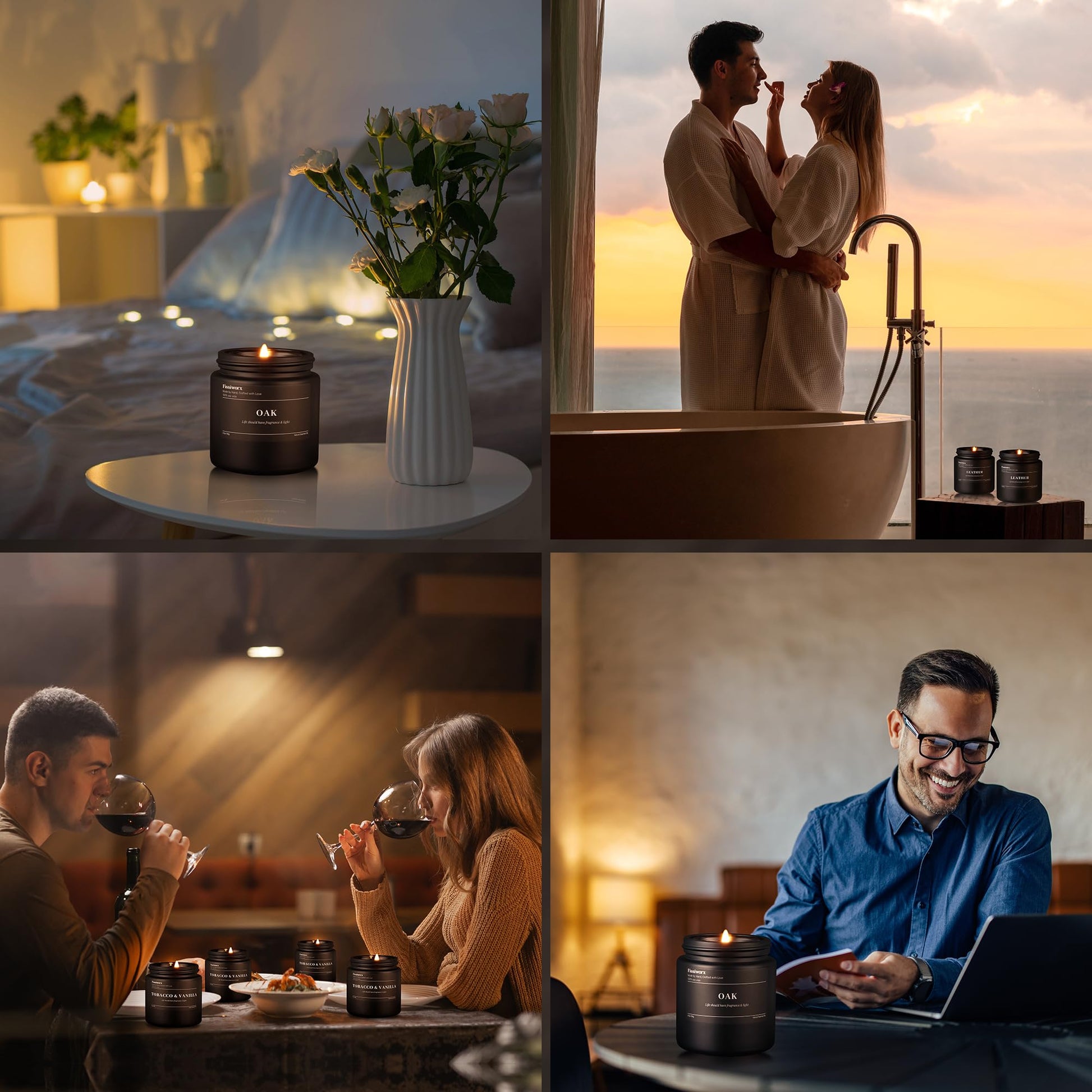 - 9 Pack Black Jar Candle Set - 3×Vanilla (Aged bourbon barrels meet caramelized Vanilla), 3×Oak (Charred whiskey casks aging in stone vaults), 3×Leather (Saddle shop patina blended with cuban cigar ash).