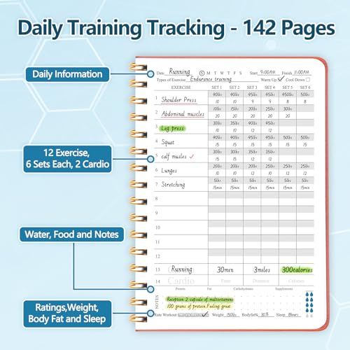 - Track Progress - Workout journal with space to record aerobic exercises, calories, times, water intake, and food. Fitness planner has 156 pages in total, 142 tracking pages. Additional pages include before-after comparison pages, and notes pages.