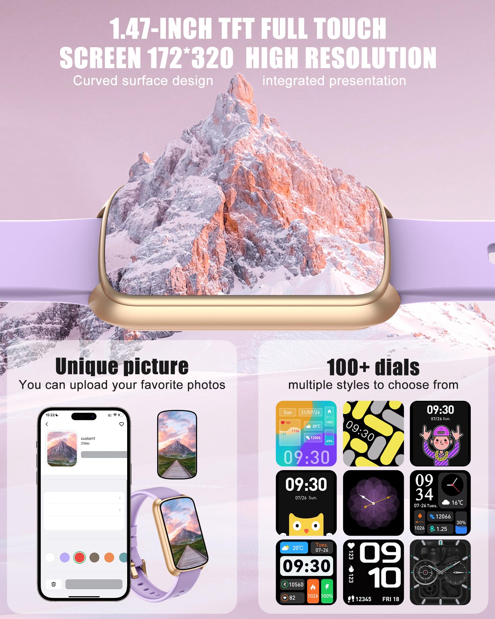 - 【1.47' Touchscreen & 200+ Dials】Enjoy a crystal-clear 1.47-inch TFT display with brilliant clarity and responsive touch control. The GloryFit app offers over 200 stylish watch faces, plus the option to upload your own photo for a personalized look. This feature-rich display seamlessly combines advanced functionality with custom style, elevating your smart watch experience.