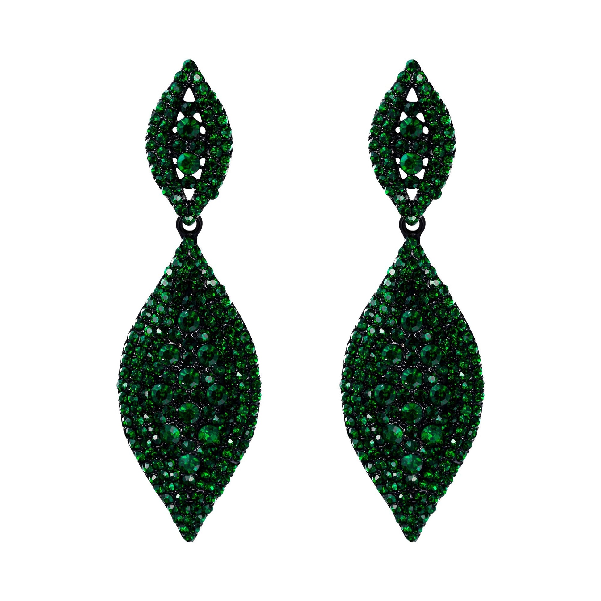 Flyonce Women's Rhinestone Crystal Wedding Bridal 2 Leaf Drop Dangle Chandelier Earrings Large Big Costume Statement Earring Green Black-Tone 3.3"