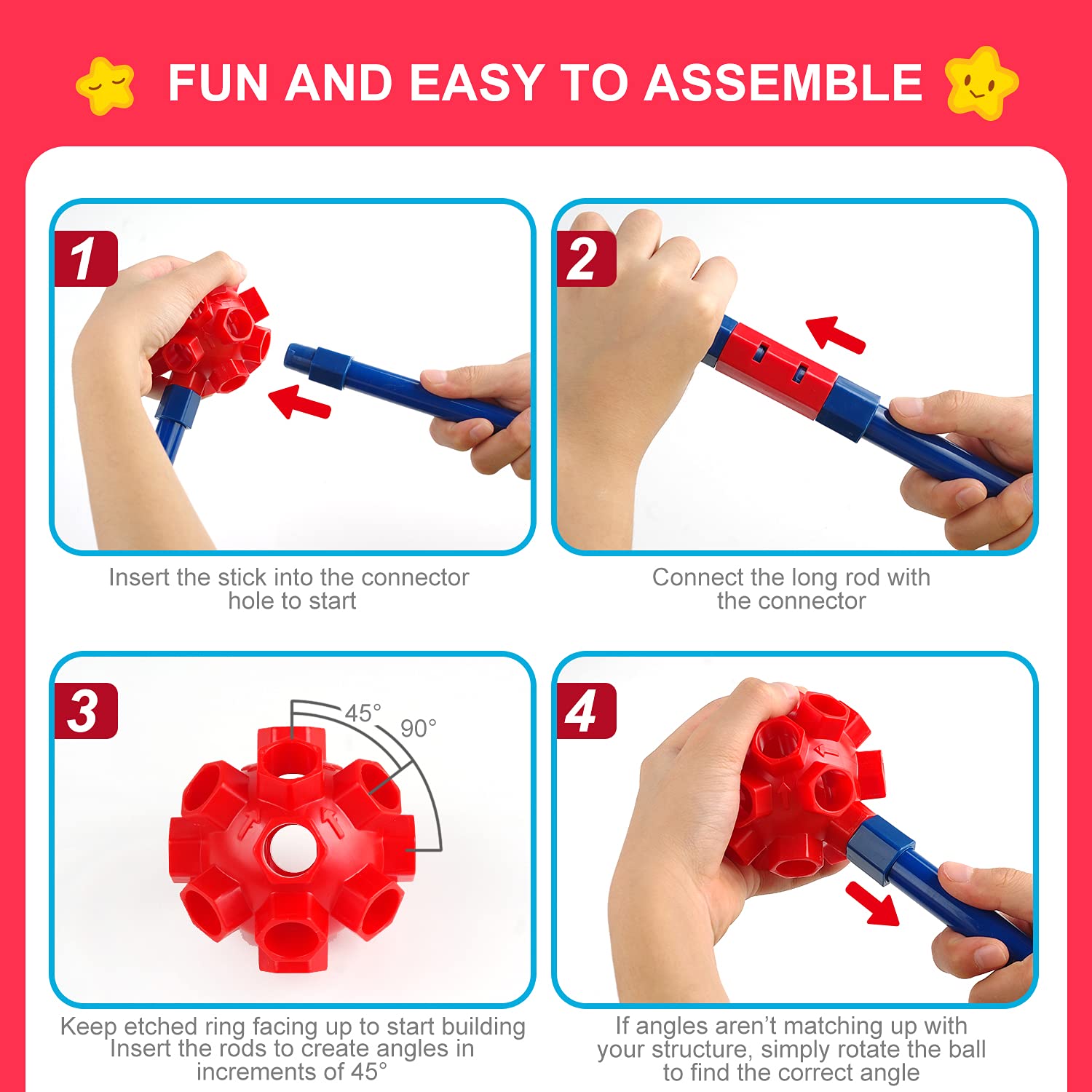 - Creative connect system-Easy to build, easy to disassemble,Won't Fall Apart.Each Creative Fort building kit comes with 30 magic balls, 64 long rods and 46 extend connectors,140 Pcs totally,rich enough to create more structures. Simply insert the rods into the balls, builder connects in a few seconds. Best of all, it's light but sturdy, supports sheets well. A handy step-by-step guide shows you how to build.